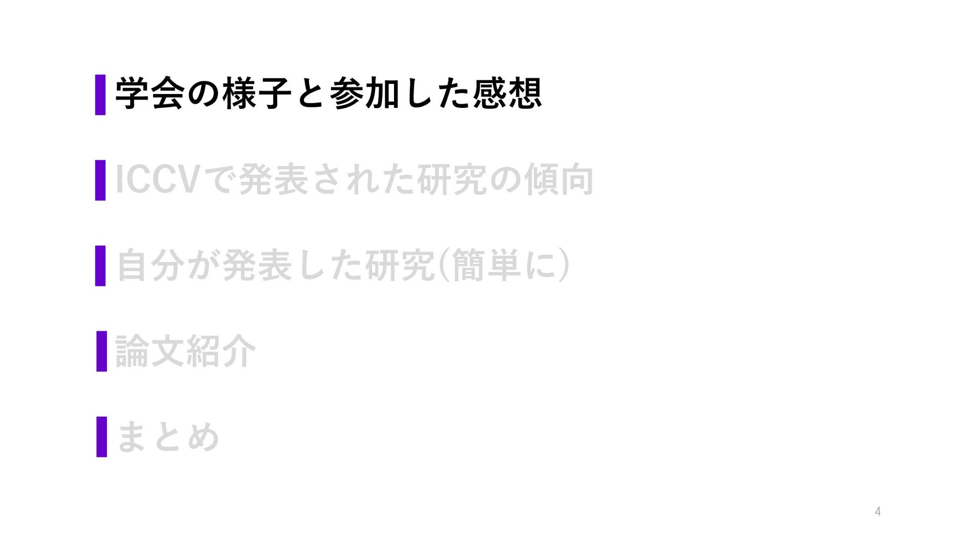 学会の様子と参加した感想 ICCVで発表された研究の傾向 自分が発表した研究(簡単に) 論文紹介 まとめ 4