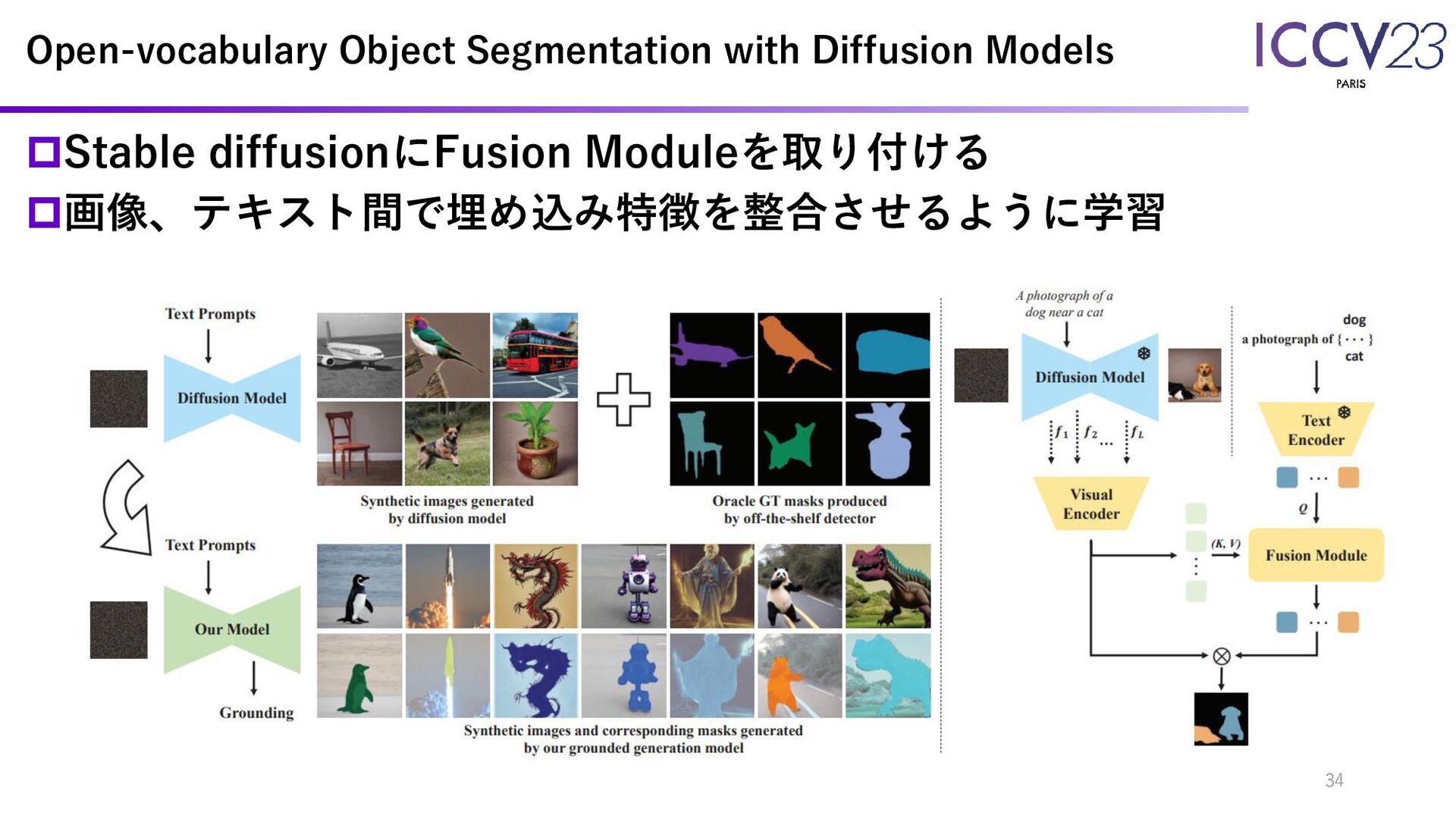 Stable diffusionにFusion Moduleを取り付ける 画像、テキスト間で埋め込み特徴を整合させるように学習 Open-vocabulary Object Segmentation with Diffusion Models