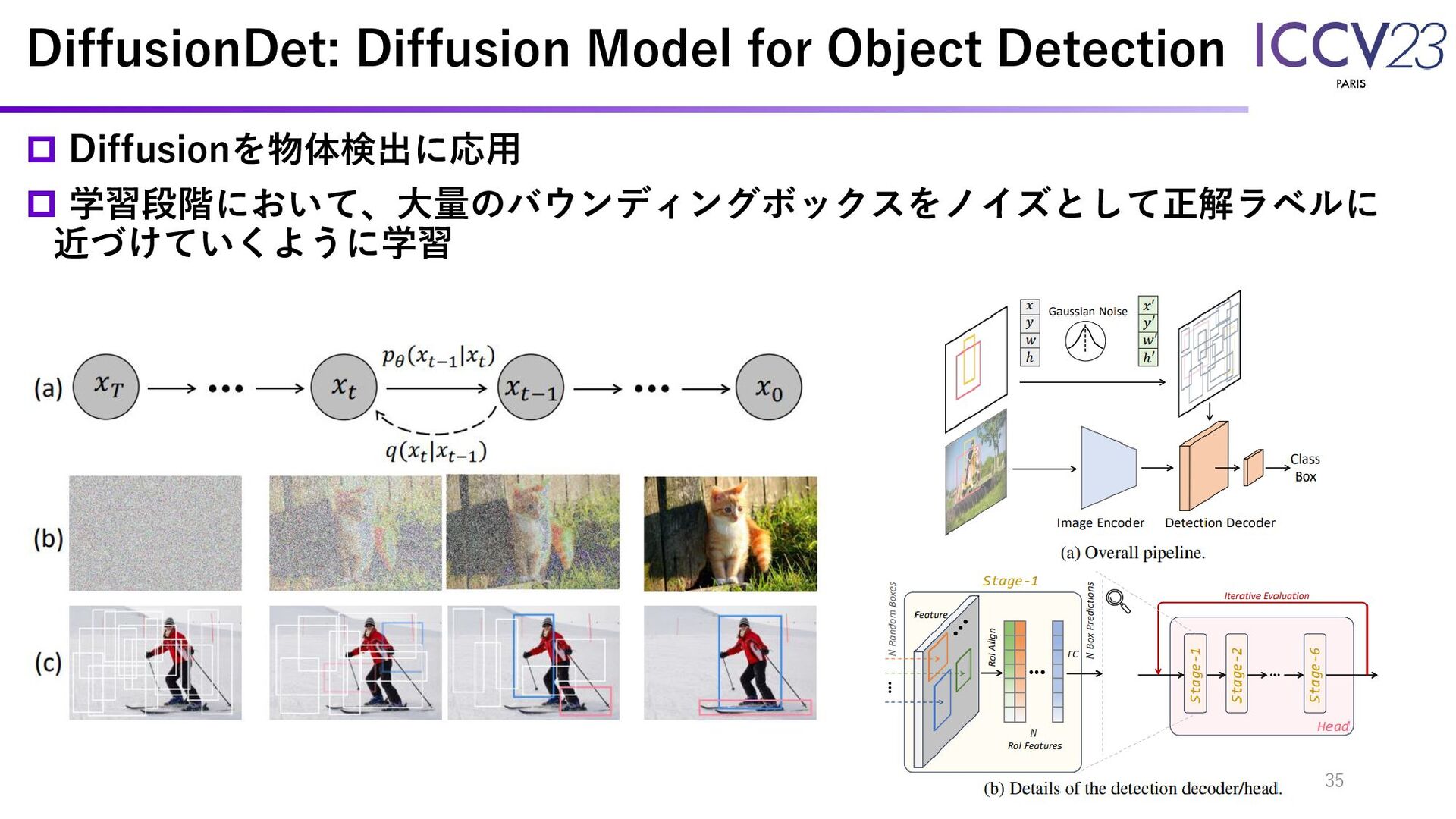 DiffusionDet: Diffusion Model for Object Detection Diffusionを物体検出に応用 学習段階において、大量のバウンディングボックスをノイズとして正解ラベルに