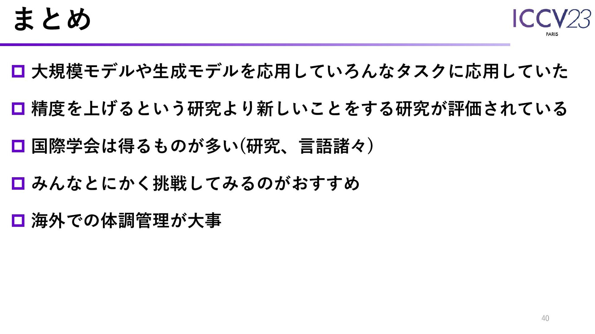 学会の様子と参加した感想 ICCVで発表された研究の傾向 論文紹介 まとめ 39