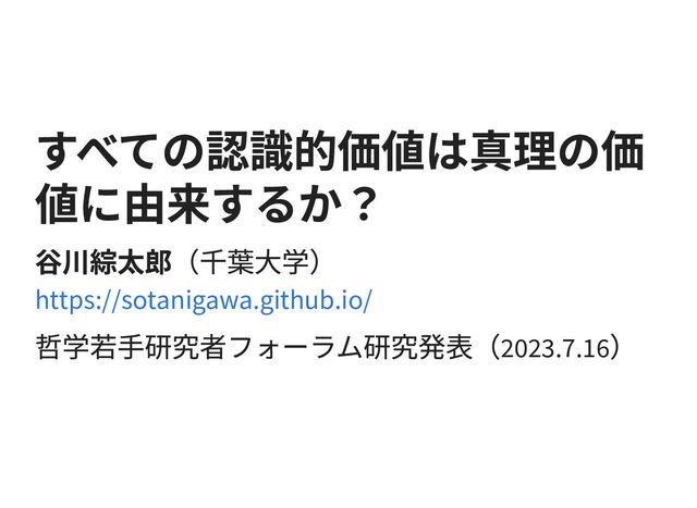 Demon. Pacific Philosophical Quarterly, 98 (1): 89–107. D. Matheson (2011). How To Be an Epistemic Value Pluralist. Dialogue, 50 (2): 391–405. D. Pritchard (2010). Knowledge and Understanding. The Nature and Value of Knowledge. Oxford University Press. E. Sosa (2003). The Place of Truth in Epistemology. Intellectual Virtue. Oxford University Press. E. Sosa (2007). A Virtue Epistemology. Oxford University Press. D. Wilkenfeld (2013). Understanding As Representation Manipulability. Synthese, 190 (6): 997–1016. L. Zagzebski (2001). Recovering Understanding. Knowledge, Truth, and Duty. Oxford University Press. 谷川綜太郎 (2021). 認識論における理解の叙実性について. 千葉大学大学院人文公共 学府研究プロジェクト報告書, 359: 40–49. 谷川綜太郎 (2023). 理解についての内在主義と外在主義. 新進研究者 Research Notes, 6.