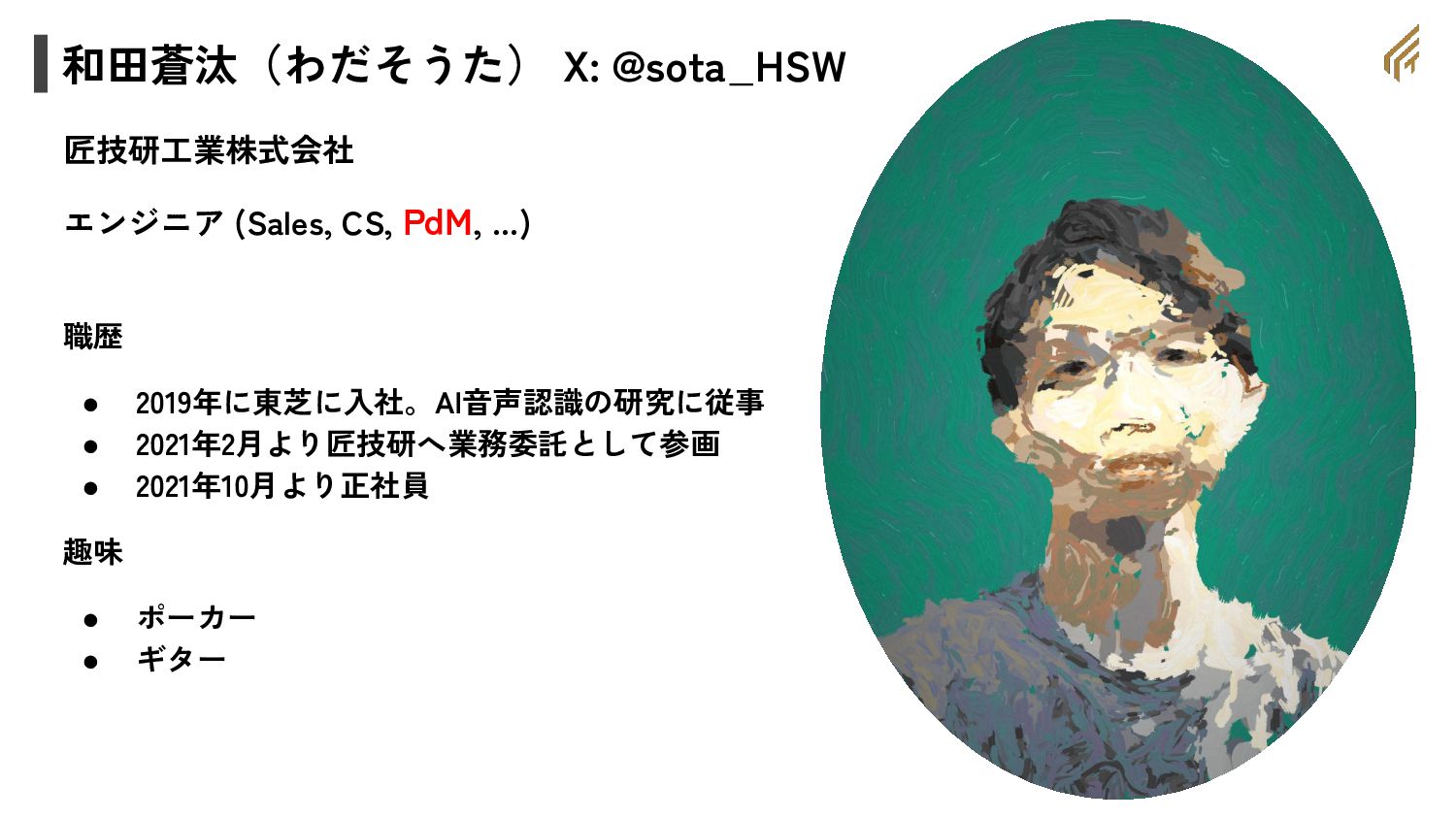 ©2023 匠技研工業株式会社 和田蒼汰(わだそうた) X: @sota_HSW 匠技研工業株式会社 エンジニア (Sales, CS, PdM, …)