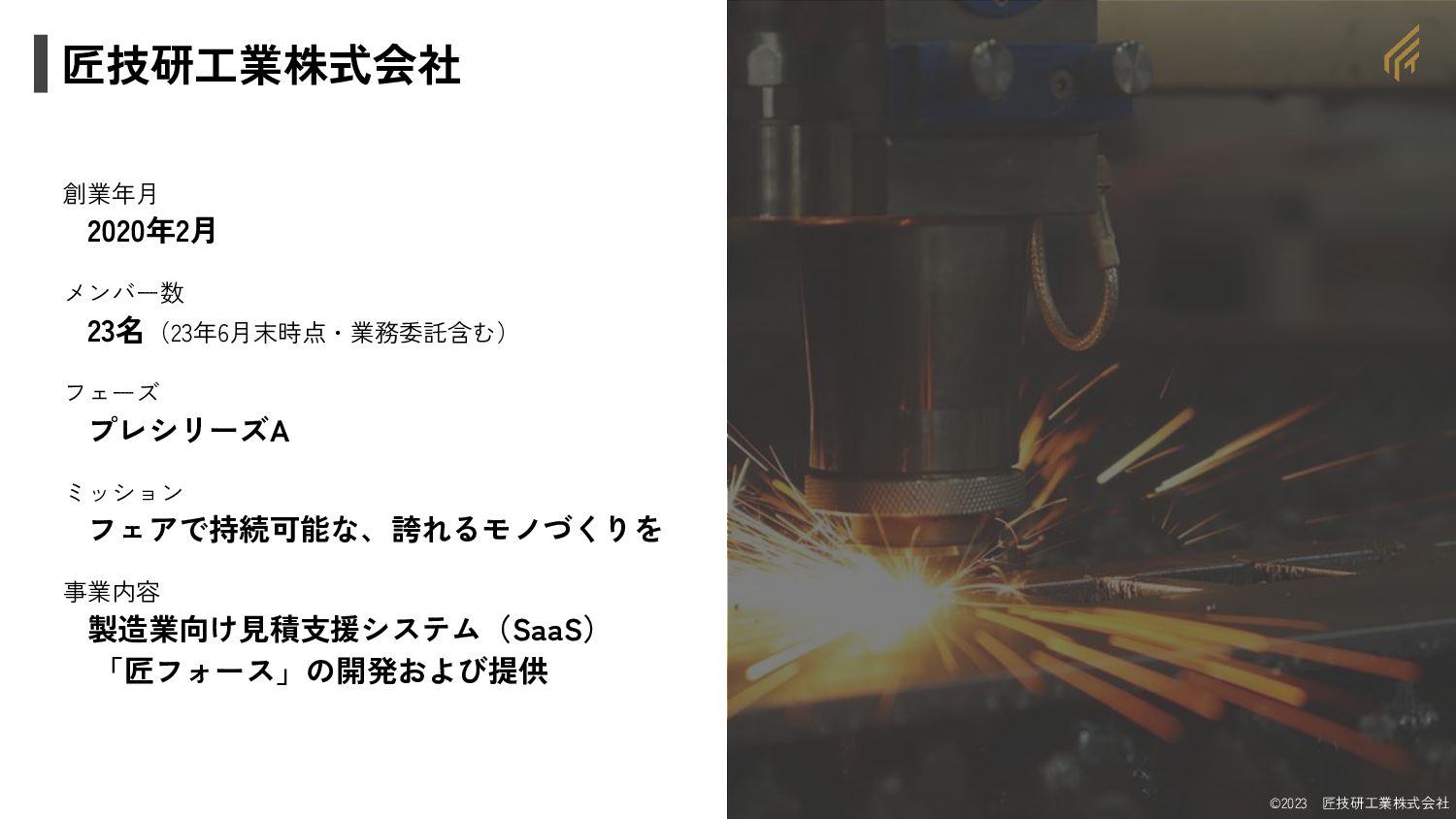 ©2023 匠技研工業株式会社 創業年月 2020年2月 メンバー数 23名(23年6月末時点・業務委託含む) フェーズ プレシリーズA ミッション フェアで持続可能な、誇れるモノづくりを 事業内容