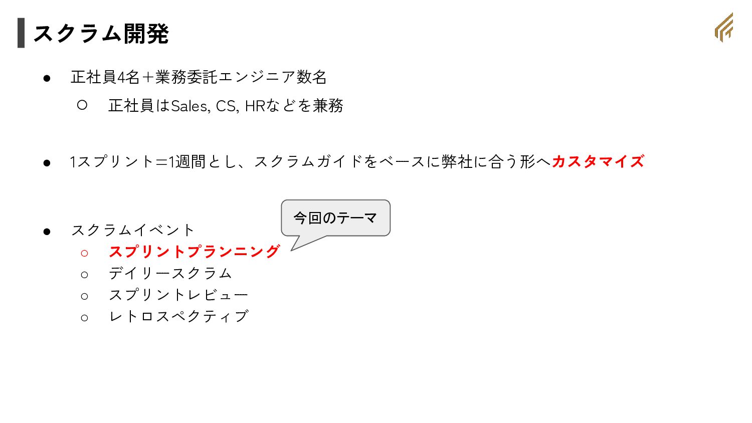 スクラムイベント ◦ スプリントプランニング ◦ デイリースクラム ◦ スプリントレビュー ◦ レトロスペクティブ スクラム開発 今回のテーマ