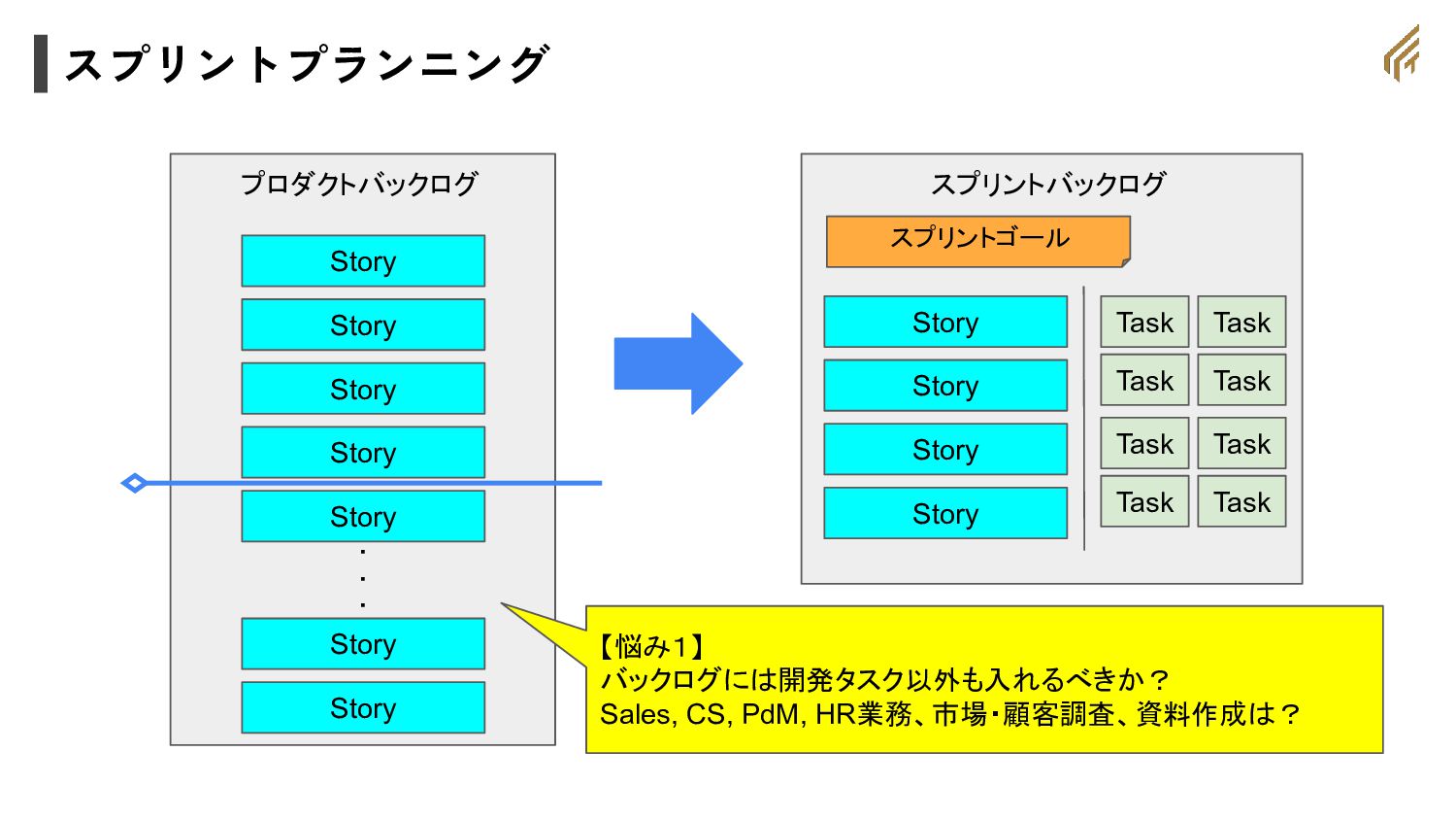 Story Story Story スプリントバックログ スプリントゴール Story Story Story Story Task Task Task Task Task Task Task Task 【悩み1】 バックログには開発タスク以外も入れるべきか? Sales, CS, PdM, HR業務、市場・顧客調査、資料作成は?