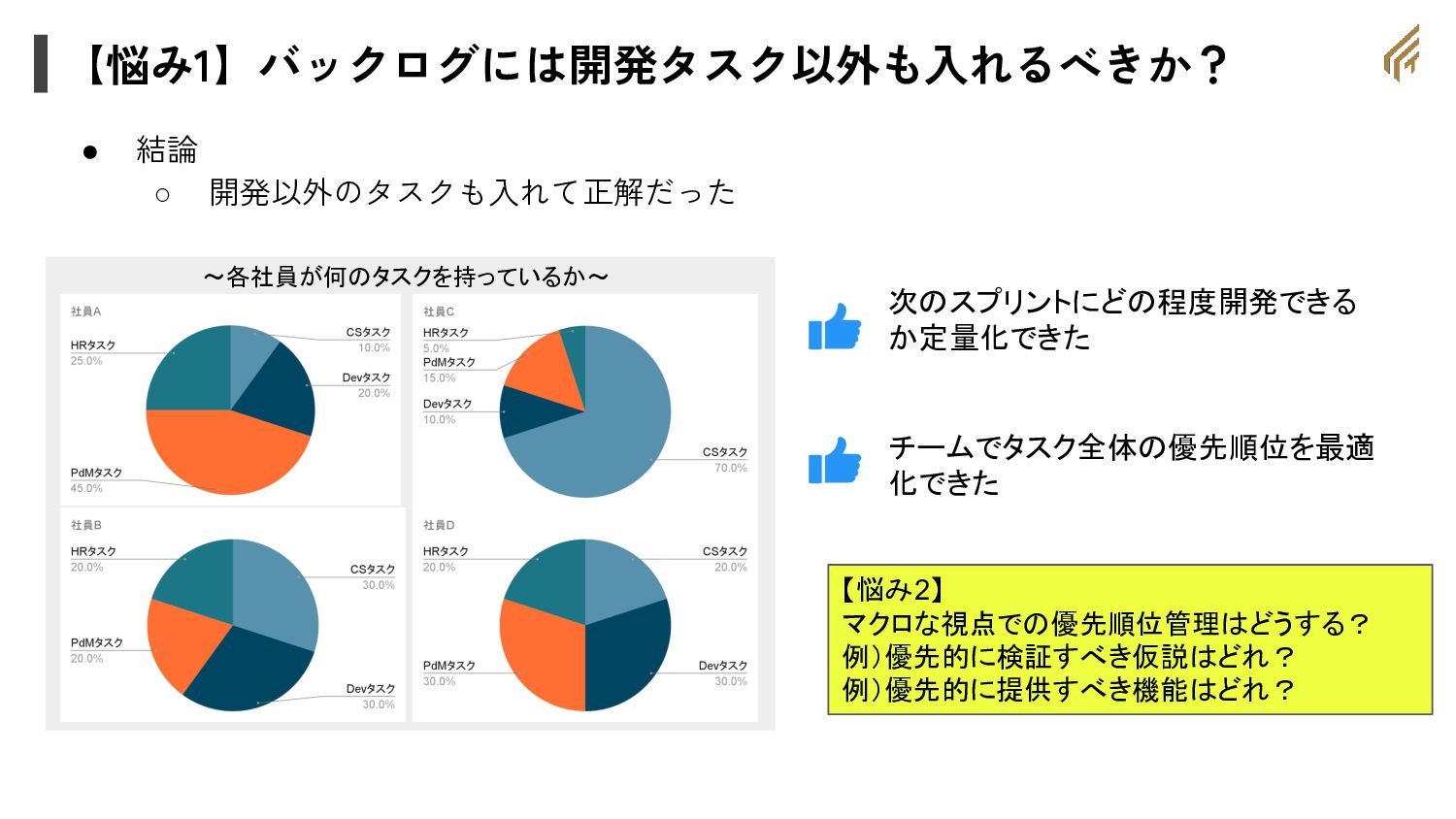 〜各社員が何のタスクを持っているか〜 【悩み2】 マクロな視点での優先順位管理はどうする? 例)優先的に検証すべき仮説はどれ? 例)優先的に提供すべき機能はどれ?