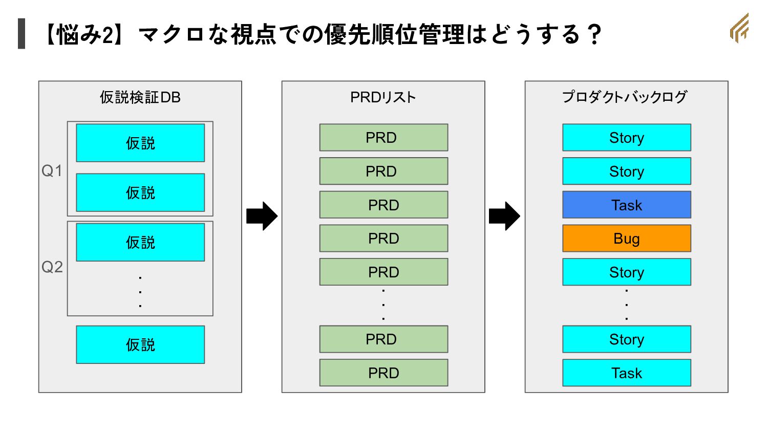 Bug Story Task 仮説 仮説 仮説検証DB ・ ・ ・ 仮説 PRD PRD PRD PRD PRDリスト ・ ・ ・ PRD PRD 仮説 PRD Q1 Q2