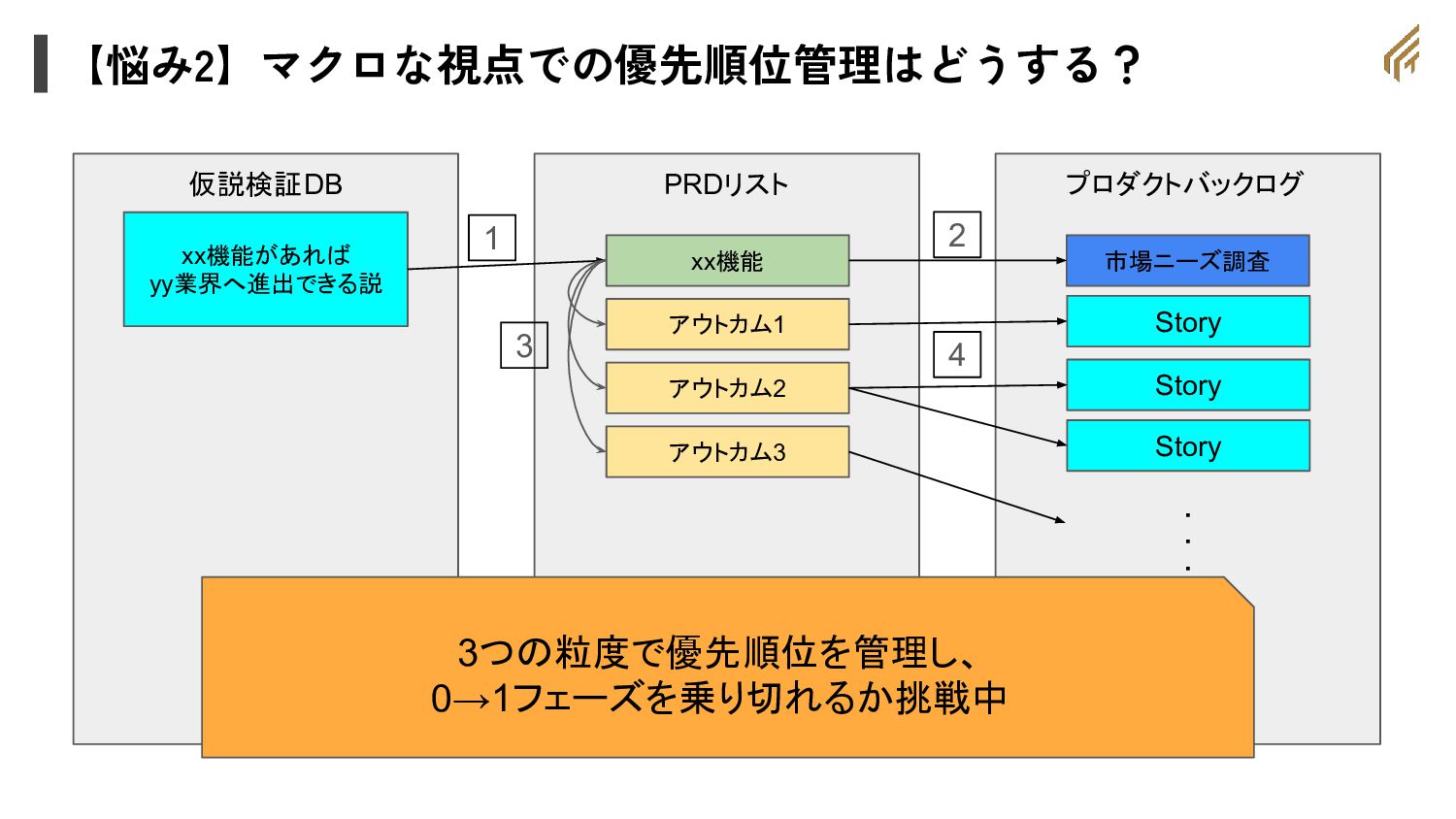 ©2023 匠技研工業株式会社 【悩み2】マクロな視点での優先順位管理はどうする? 市場ニーズ調査 プロダクトバックログ xx機能があれば yy業界へ進出できる説 仮説検証DB xx機能 アウトカム1 PRDリスト