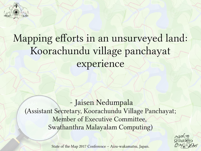 – No Resource Map, No Cadastral Map, No GIS. But pops up several instances to draw maps: Kasturirangan report, Ward delimitation, Sevagram Gramakendram etc. Need baseline GeoData for Developmental Planning and Implementation and to empower the stakeholders. Need of OpenGeoData in case of Emergencies - without hassle. It is easy to draw maps from the layers of GIS, when in need. If there is commonly accessible repository of OpenGeoData, people can access the data when they need, without any formal requests to the village panchayat, satisfying the responsibility imposed by RTI Act - Sec: 4(1), 4(2), 4(3), 4(4). State of the Map 2017 Conference – Aizu-wakamatsu, Japan.