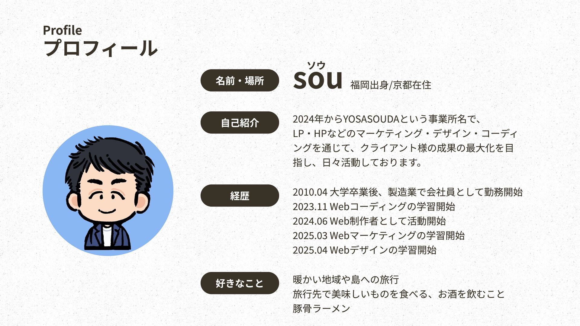 1. 名前・場所 sou 福岡出身/京都在住 自己紹介 2024年からYOSASOUDAという事業所名で、 LP・HPなどのマーケティング・デザイン・コーディ ングを通じて、クライアント様の成果の最大化を目 指し、日々活動しております。 経歴 2010.04