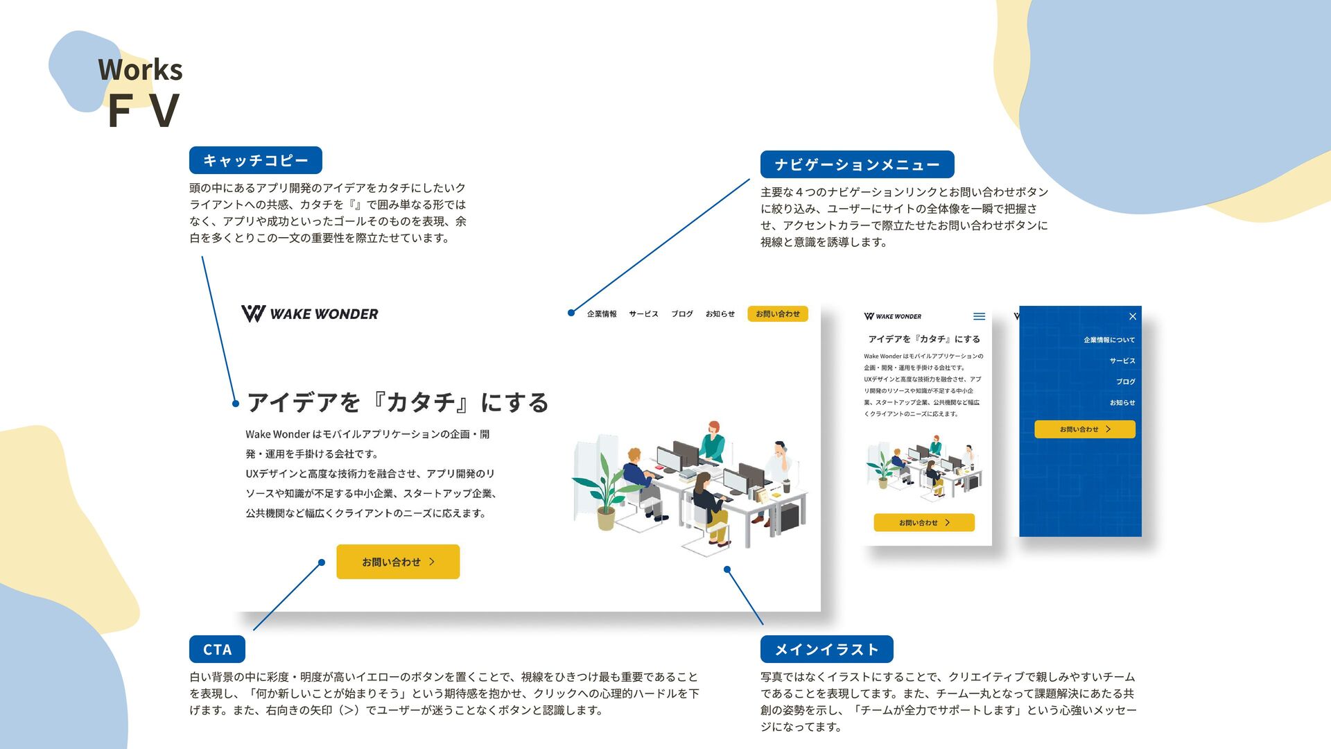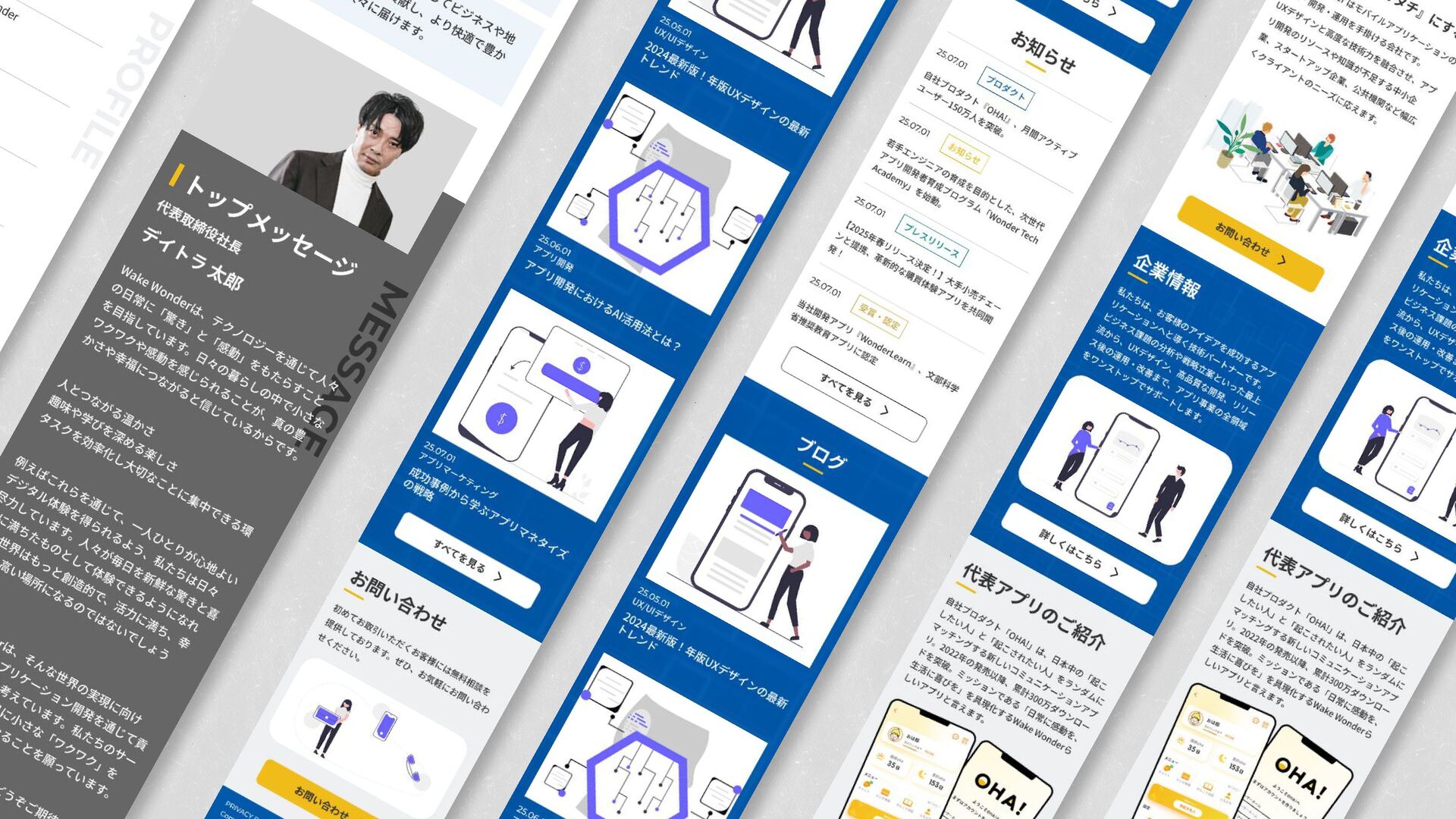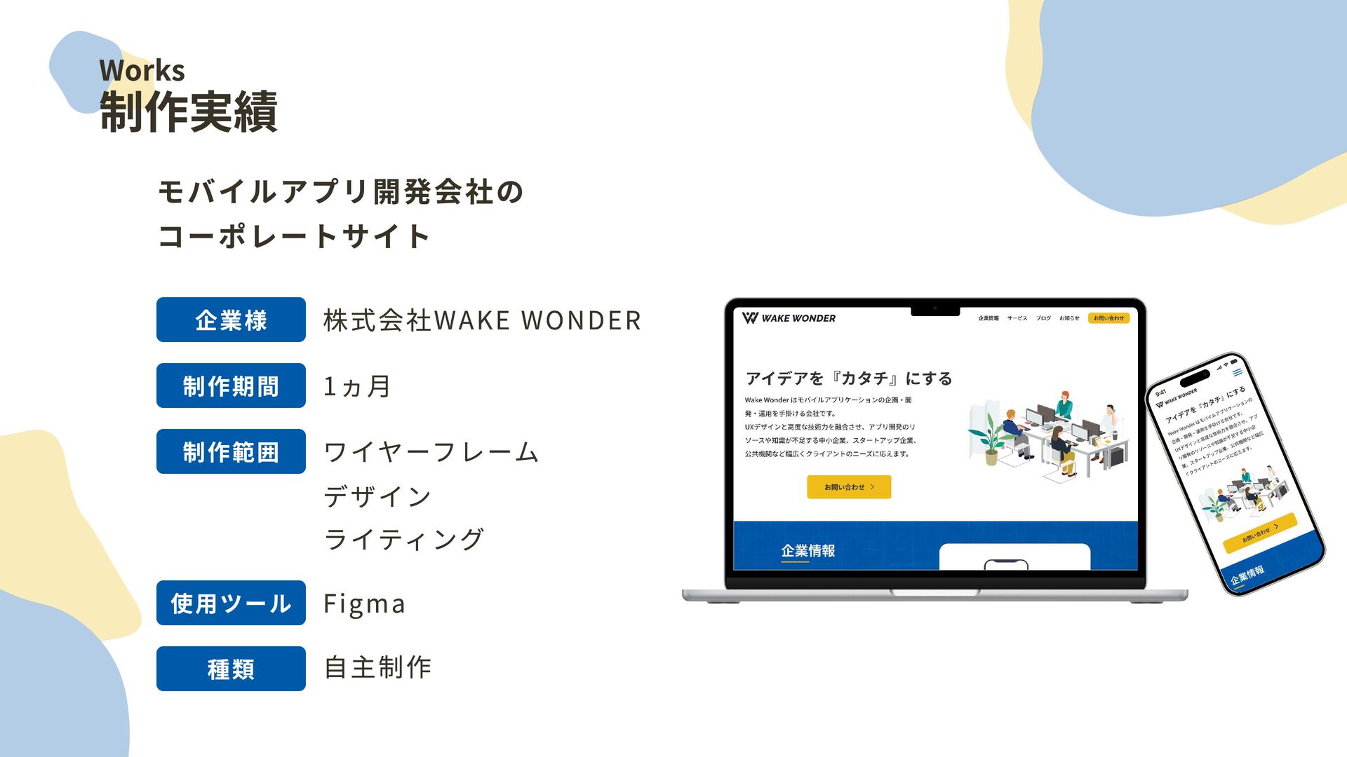 6. Works 制作実績 モバイルアプリ開発会社の コーポレートサイト 企業様 株式会社WAKE WONDER 制作期間 1ヵ月 制作範囲