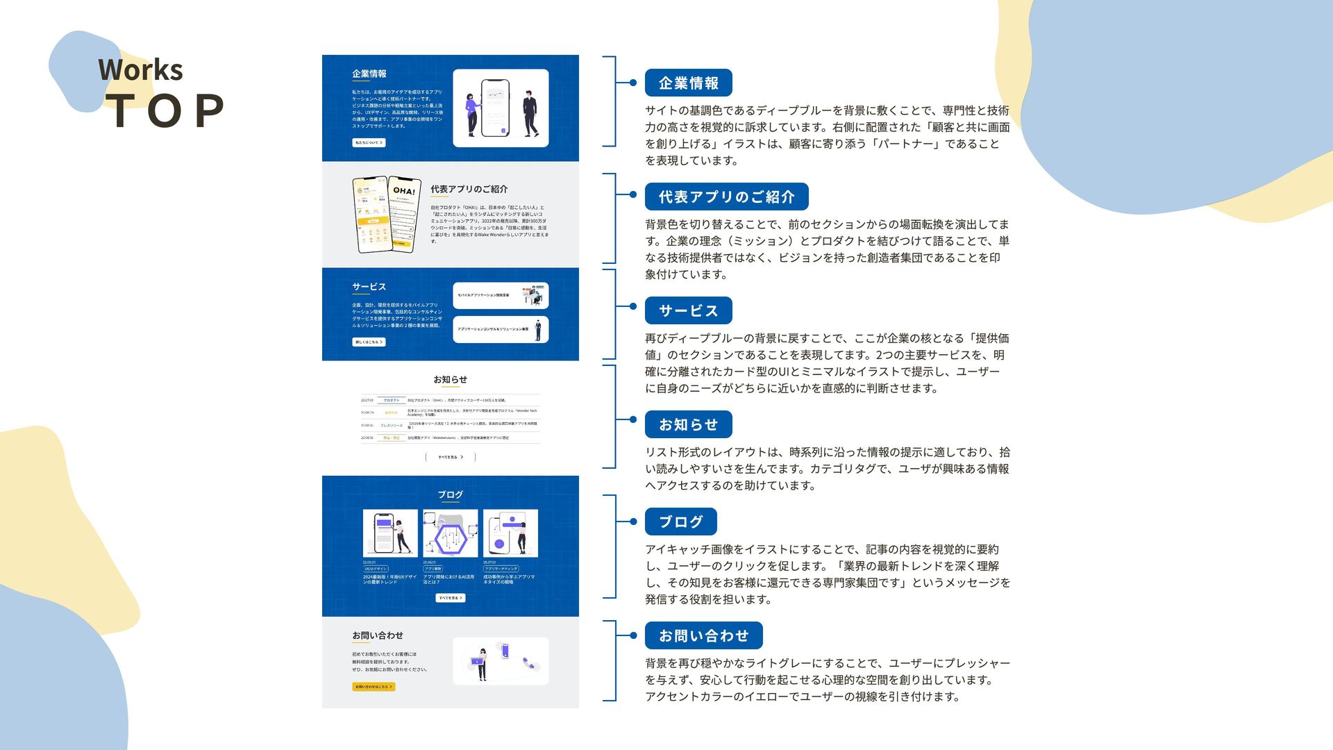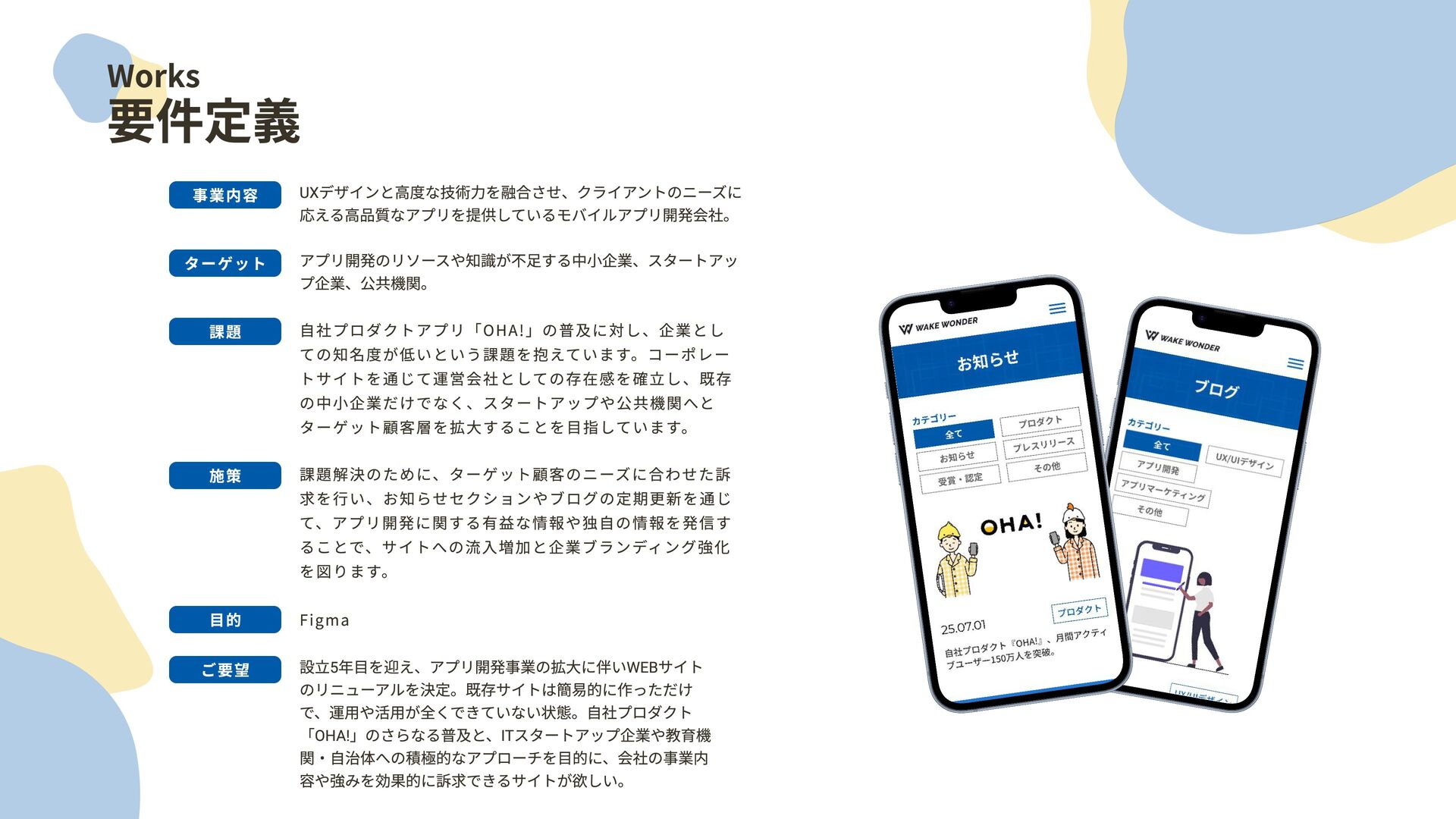 の中小企業だけでなく、スタートアップや公共機関へと ターゲット顧客層を拡大することを目指しています。 施策 課題解決のために、ターゲット顧客のニーズに合わせた訴 求を行い、お知らせセクションやブログの定期更新を通じ て、アプリ開発に関する有益な情報や独自の情報を発信す ることで、サイトへの流入増加と企業ブランディング強化 を図ります。 目的 Figma ご要望 設立5年目を迎え、アプリ開発事業の拡大に伴いWEBサイト のリニューアルを決定。既存サイトは簡易的に作っただけ で、運用や活用が全くできていない状態。自社プロダクト 「OHA!」のさらなる普及と、ITスタートアップ企業や教育機 関・自治体への積極的なアプローチを目的に、会社の事業内 容や強みを効果的に訴求できるサイトが欲しい。 Works 要件定義