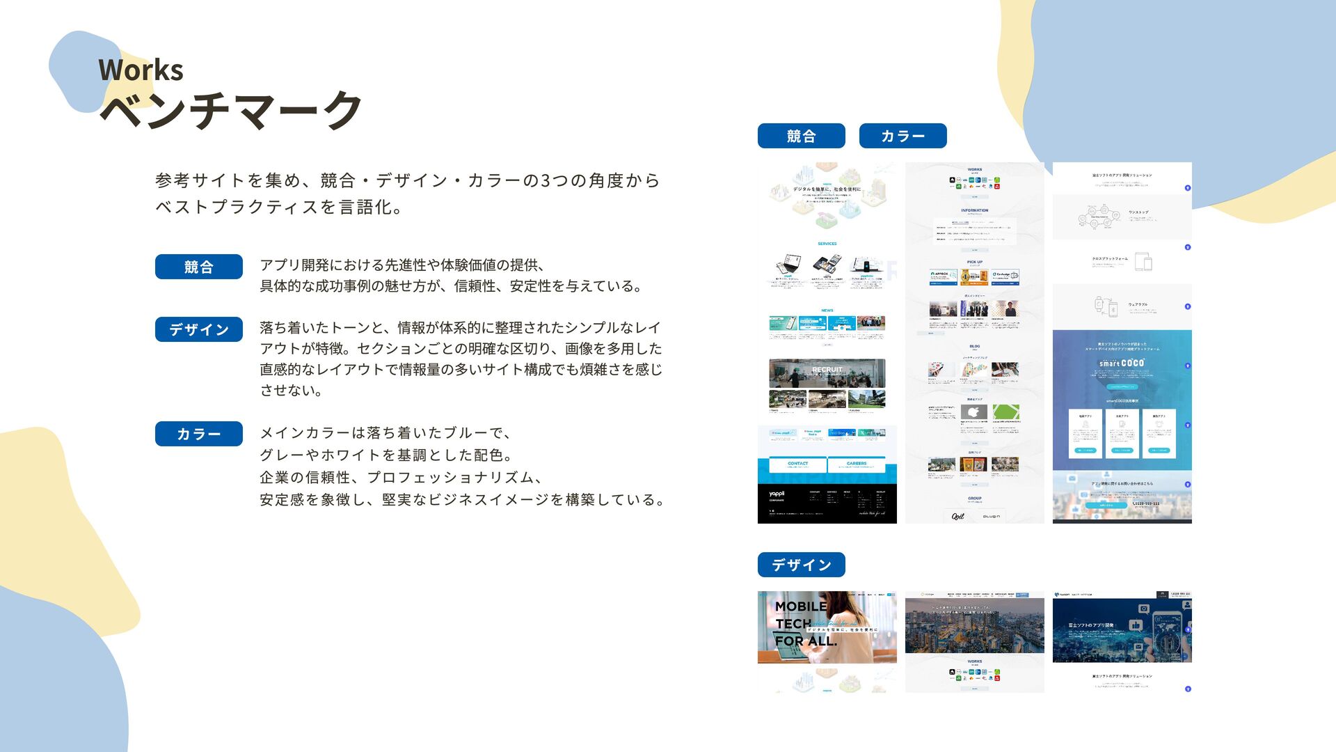 8. Works ベンチマーク 競合 アプリ開発における先進性や体験価値の提供、 具体的な成功事例の魅せ方が、信頼性、安定性を与えている。 デザイン 落ち着いたトーンと、情報が体系的に整理されたシンプルなレイ アウトが特徴。セクションごとの明確な区切り、画像を多用した 直感的なレイアウトで情報量の多いサイト構成でも煩雑さを感じ させない。