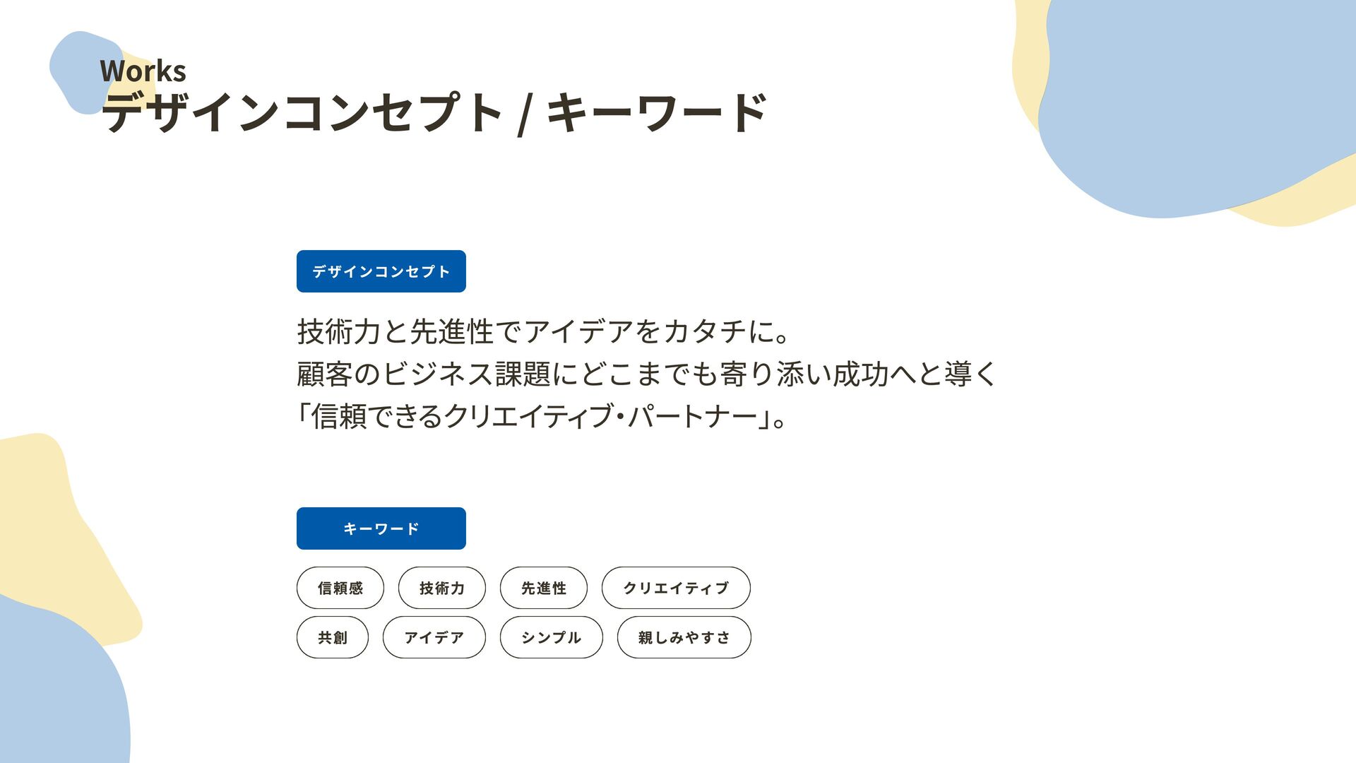なる技術提供者ではなく、ビジョンを持った創造者集団であることを印 象付けています。 サービス 再びディープブルーの背景に戻すことで、ここが企業の核となる「提供価 値」のセクションであることを表現してます。2つの主要サービスを、明 確に分離されたカード型のUIとミニマルなイラストで提示し、ユーザー に自身のニーズがどちらに近いかを直感的に判断させます。 お知らせ リスト 形式の レイ アウトは、 時系列に 沿った 情報の提示に 適して おり、 拾 い 読みし やすいさを 生んでます。カ テゴリタグで、ユーザが 興味ある 情報 へアクセスするのを 助けています。 ブログ アイ キャッ チ画 像をイラストにすることで、 記事の 内容を視覚的に要 約 し、ユーザーのク リックを 促します。「業 界の 最新ト レンドを 深く理 解 し、 その 知見を お客 様に 還元で きる専門 家集団です」という メッセージを 発信する 役割を 担います。 お問い合わせ 背景を再び 穏やかなライト グレーにすることで、ユーザーにプ レッシ ャー を 与え ず、 安心して 行動を 起こせる 心理的な 空間を創り出しています 。 アクセントカラーのイ エローでユーザーの視 線を 引き付けます。