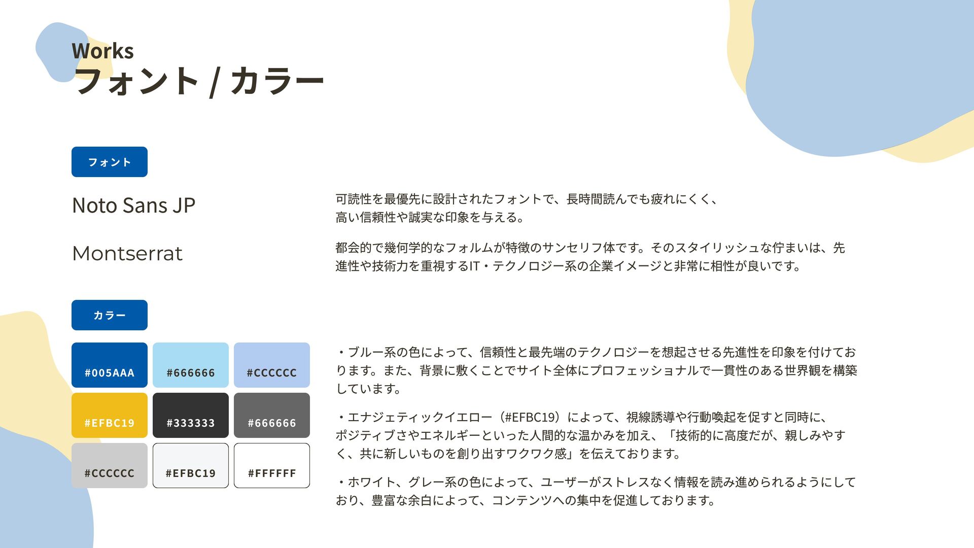 Montserrat 都会的で幾何学的なフォルムが特徴のサンセリフ体です。そのスタイリッシュな佇まいは、先 進性や技術力を重視するIT・テクノロジー系の企業イメージと非常に相性が良いです。 カラー #005AAA #666666 #CCCCCC #EFBC19 #333333 #666666 #CCCCCC #EFBC19 #FFFFFF ・ブルー系の色によって、信頼性と最先端のテクノロジーを想起させる先進性を印象を付けてお ります。また、背景に敷くことでサイト全体にプロフェッショナルで一貫性のある世界観を構築 しています。 ・ エナジェテ ィックイ エロー (#EFBC19)によって、視 線誘導や 行動喚起を 促すと 同時に、 ポジテ ィブさや エネル ギーといった 人間的な 温かみを 加え、 「技術的に高 度だが、 親し みやす く、 共に 新しいものを 創り 出す ワク ワク 感」を 伝えております。 ・ ホワイト、 グレー系の色によって、 ユー ザーがスト レスなく 情報を読 み進 められるよ うにして おり、 豊富な 余白によって、 コンテン ツへの 集中を 促進しております。