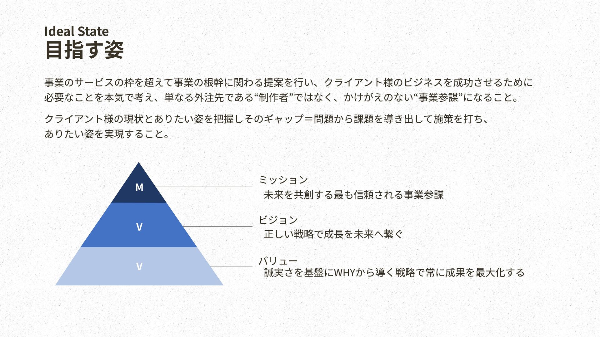 ありたい姿を実現すること。 事業のサービスの枠を超えて事業の根幹に関わる提案を行い、クライアント様のビジネスを成功させるために 必要なことを本気で考え、単なる外注先である“制作者”ではなく、かけがえのない“事業参謀”になること。 Ideal State 目指す姿
