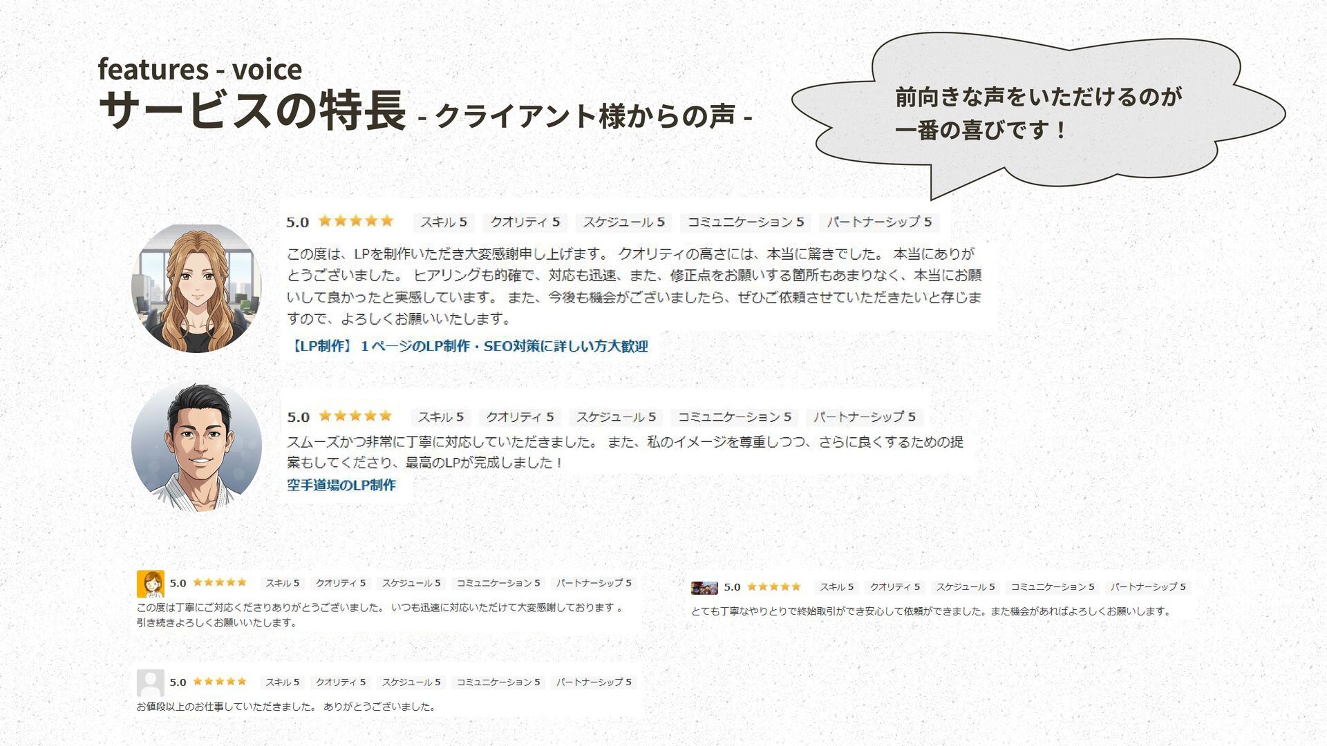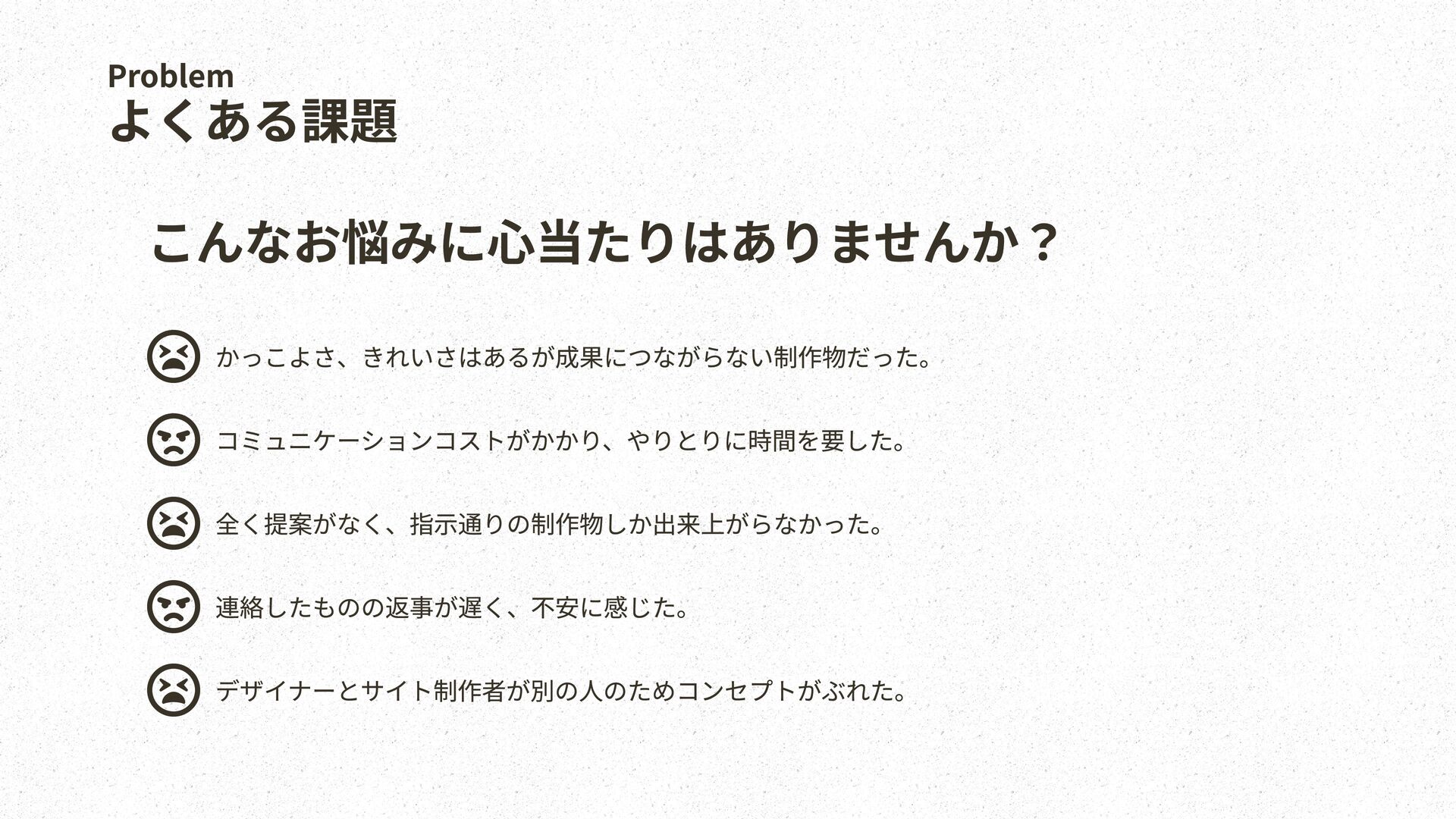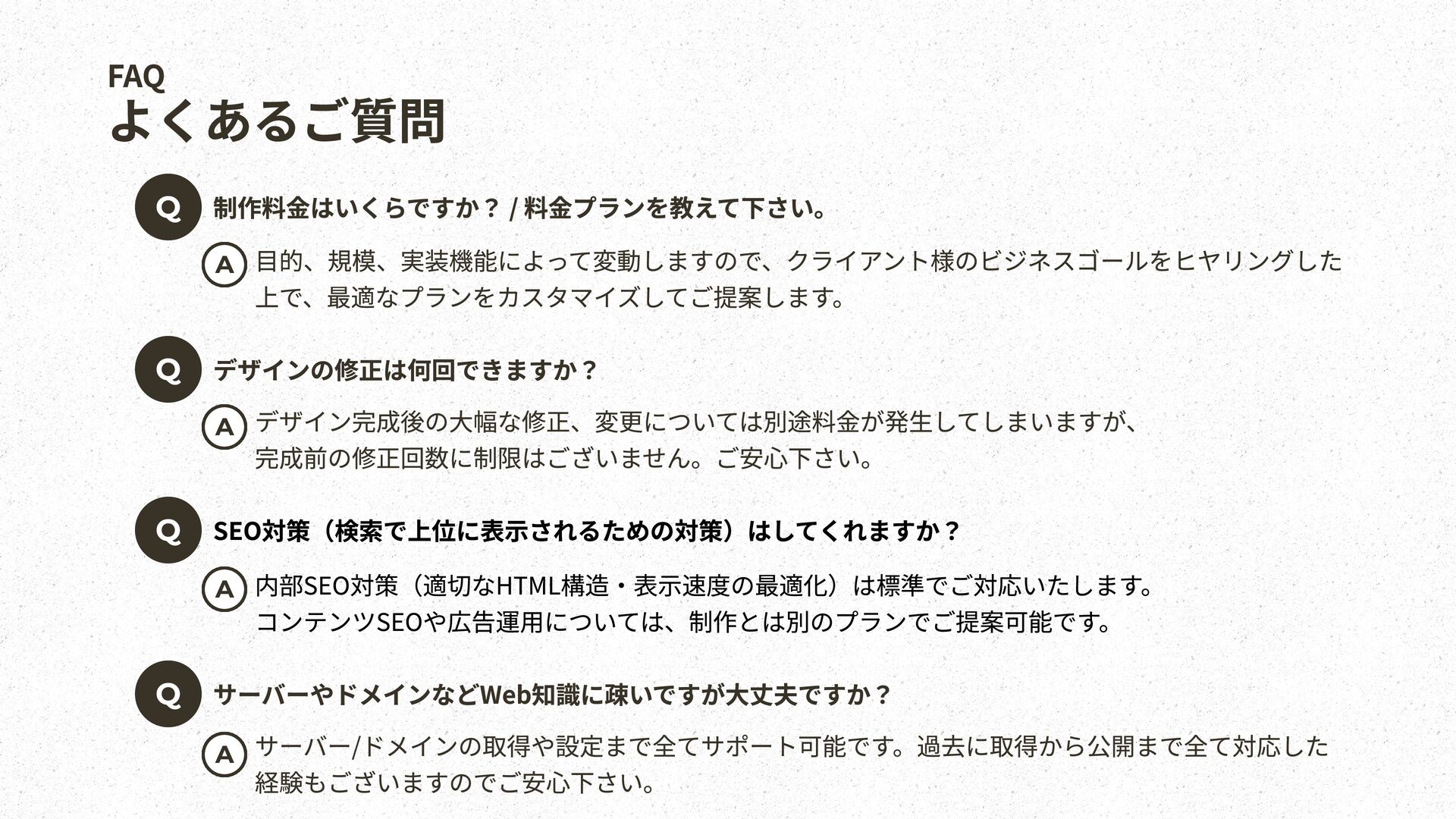 Q デザイン完成後の大幅な修正、変更については別途料金が発生してしまいますが、 完成前の修正回数に制限はございません。ご安心下さい。 A SEO対策(検索で上位に表示されるための対策)はしてくれますか? Q 内部SEO対策(適切なHTML構造・表示速度の最適化)は標準でご対応いたします。 コンテンツSEOや広告運用については、制作とは別のプランでご提案可能です。 A サーバーやドメインなどWeb知識に疎いですが大丈夫ですか? Q サーバー/ドメインの取得や設定まで全てサポート可能です。過去に取得から公開まで全て対応した 経験もございますのでご安心下さい。 A