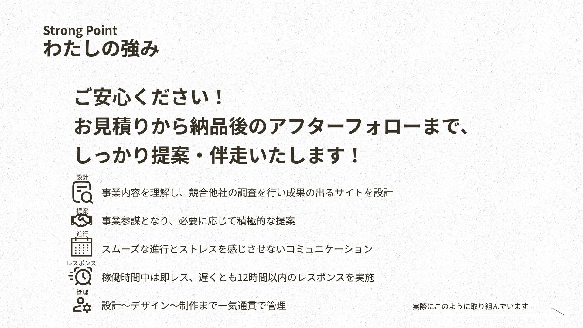 Point わたしの強み 事業内容を理解し、競合他社の調査を行い成果の出るサイトを設計 事業参謀となり、必要に応じて積極的な提案 スムーズな進行とストレスを感じさせないコミュニケーション 稼働時間中は即レス、遅くとも12時間以内のレスポンスを実施 設計~デザイン~制作まで一気通貫で管理