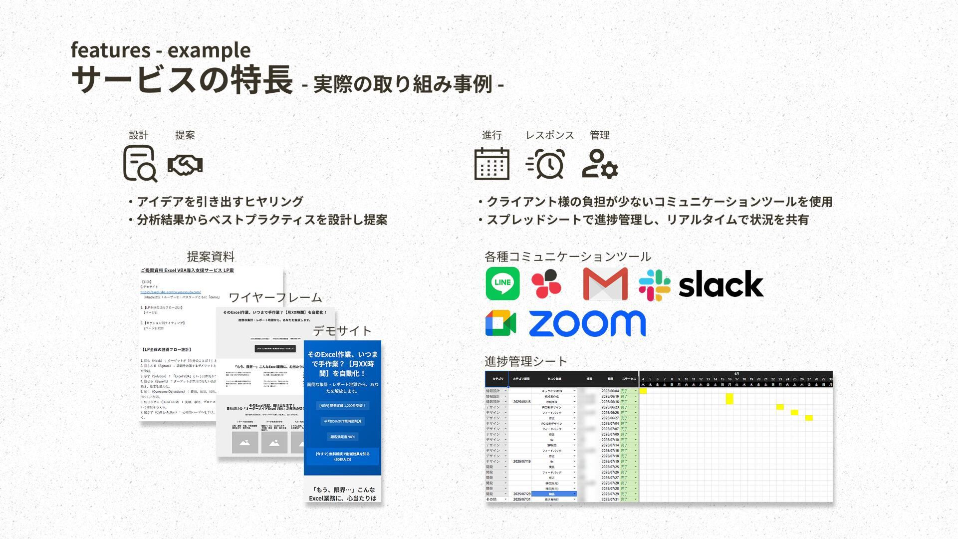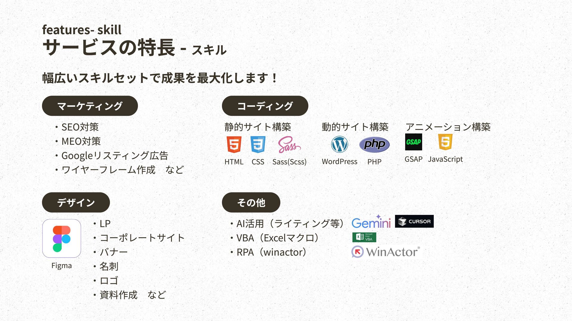 ・RPA(winactor) ・SEO対策 ・MEO対策 ・Googleリスティング広告 ・ワイヤーフレーム作成 など features- skill サービスの特長 - スキル マーケティング デザイン コーディング その他 静的サイト構築 HTML CSS Sass(Scss) 動的サイト構築 WordPress PHP アニメーション構築 JavaScript GSAP