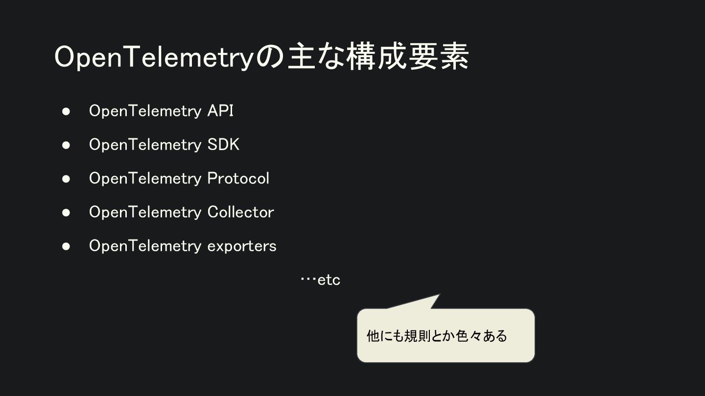 OpenTelemetryの主な構成要素 他にも規則とか色々ある
