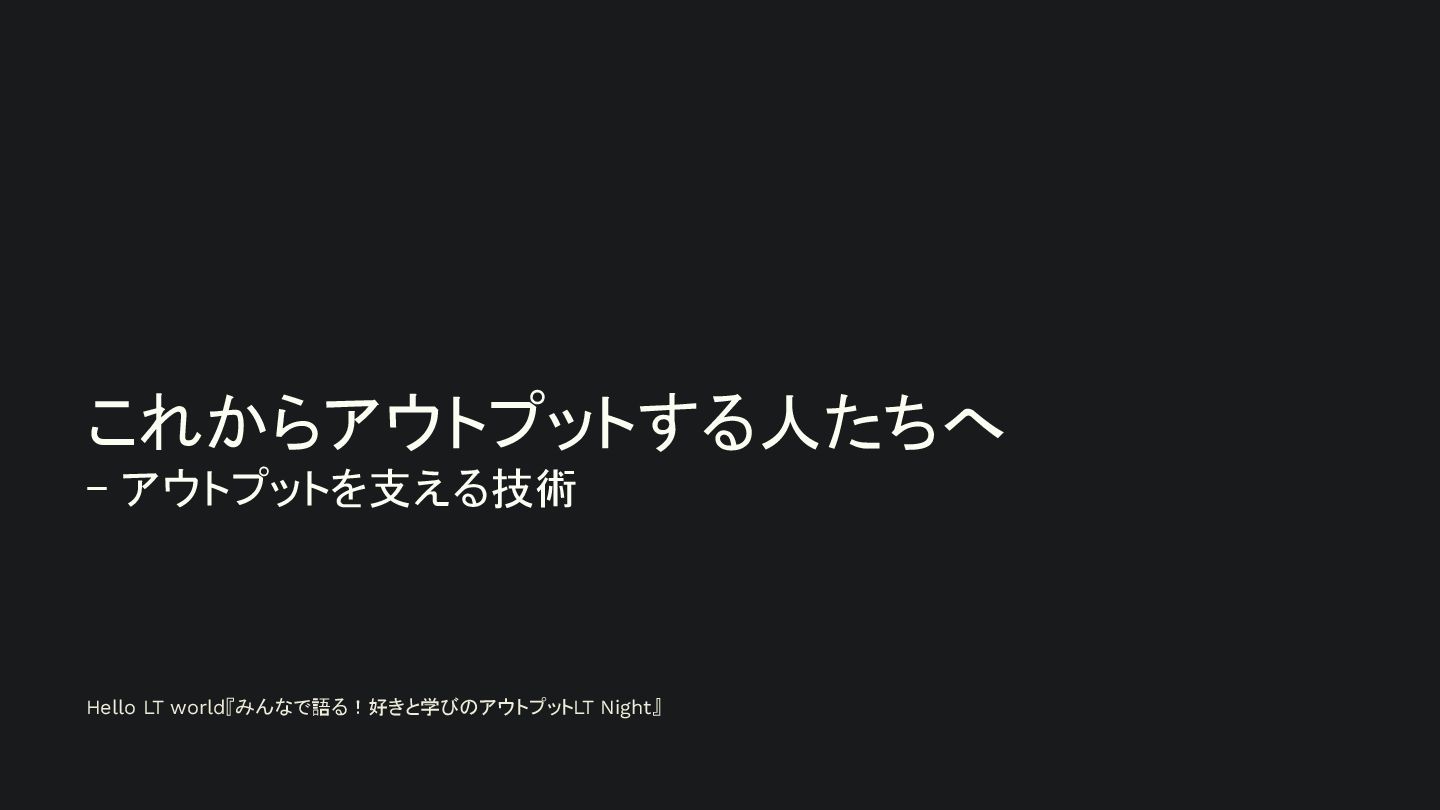 Hello LT world『みんなで語る!好きと学びのアウトプット LT Night』の登壇資料です。 https://findy.connpass.com/event/372581/