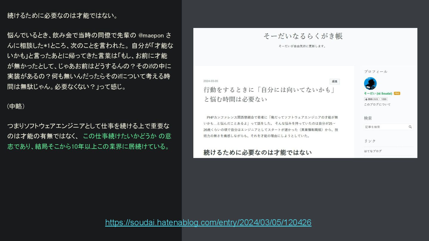 # 参考資料 - https://soudai.hatenablog.com/entry/2024/03/05/120426 - https://speakerdeck.com/soudai/every-little-bit-counts