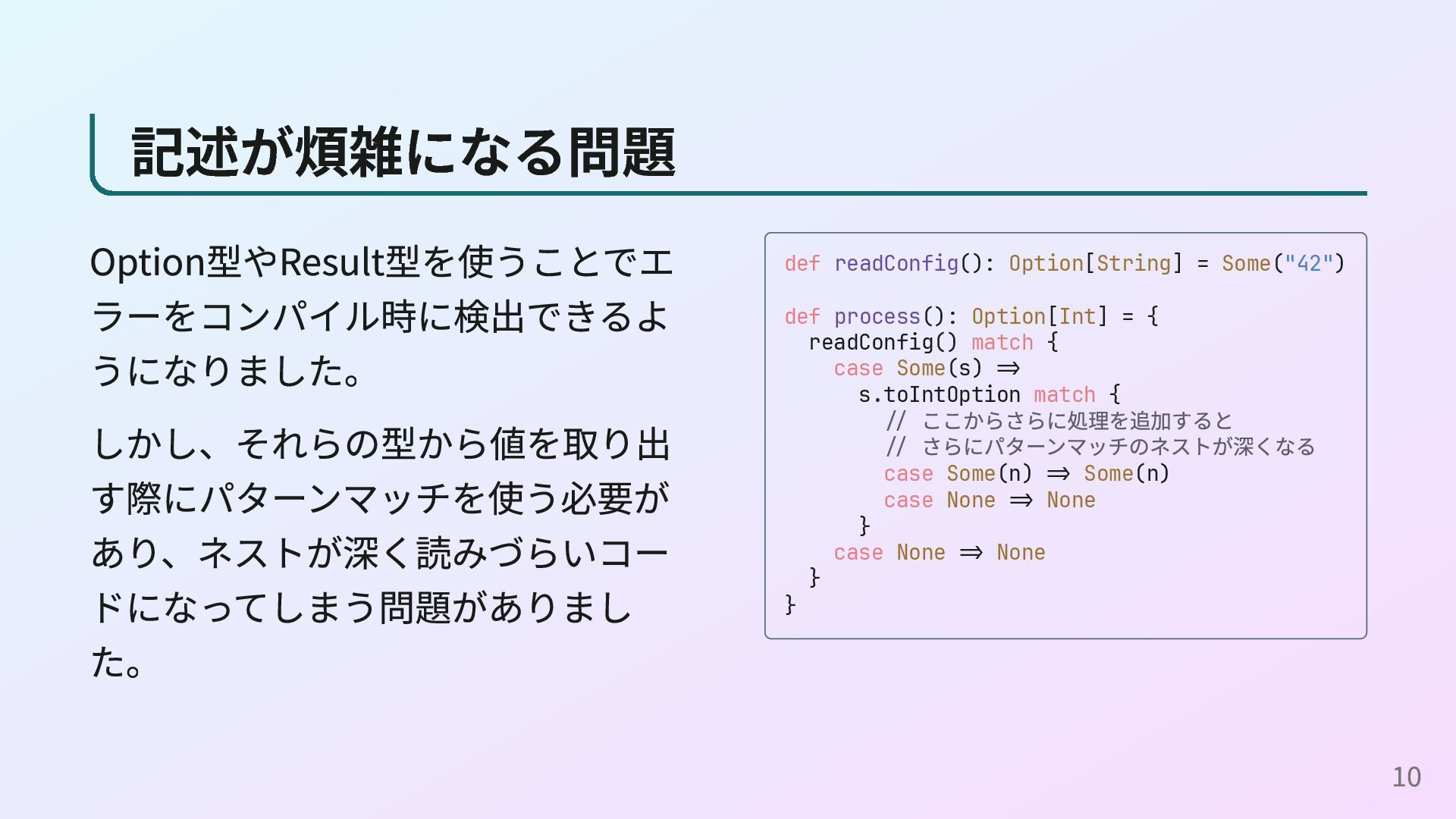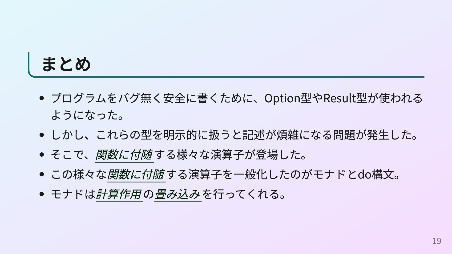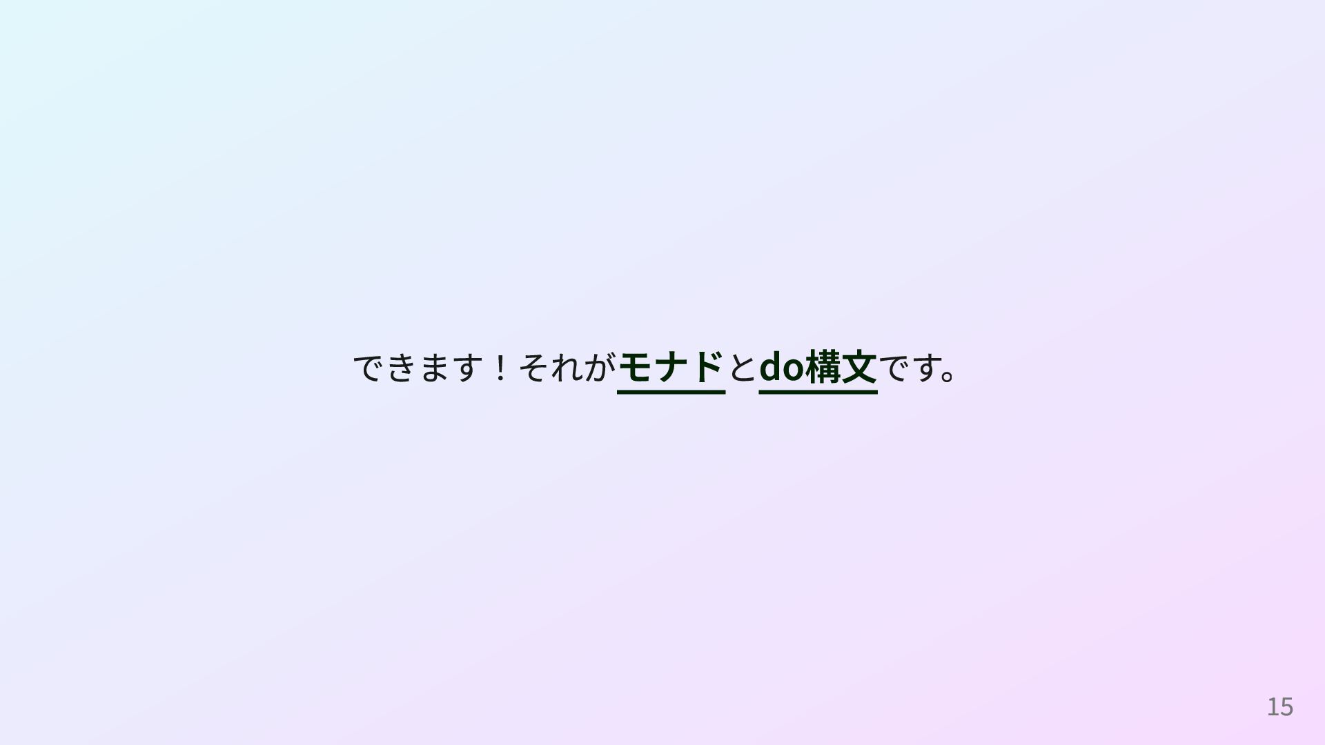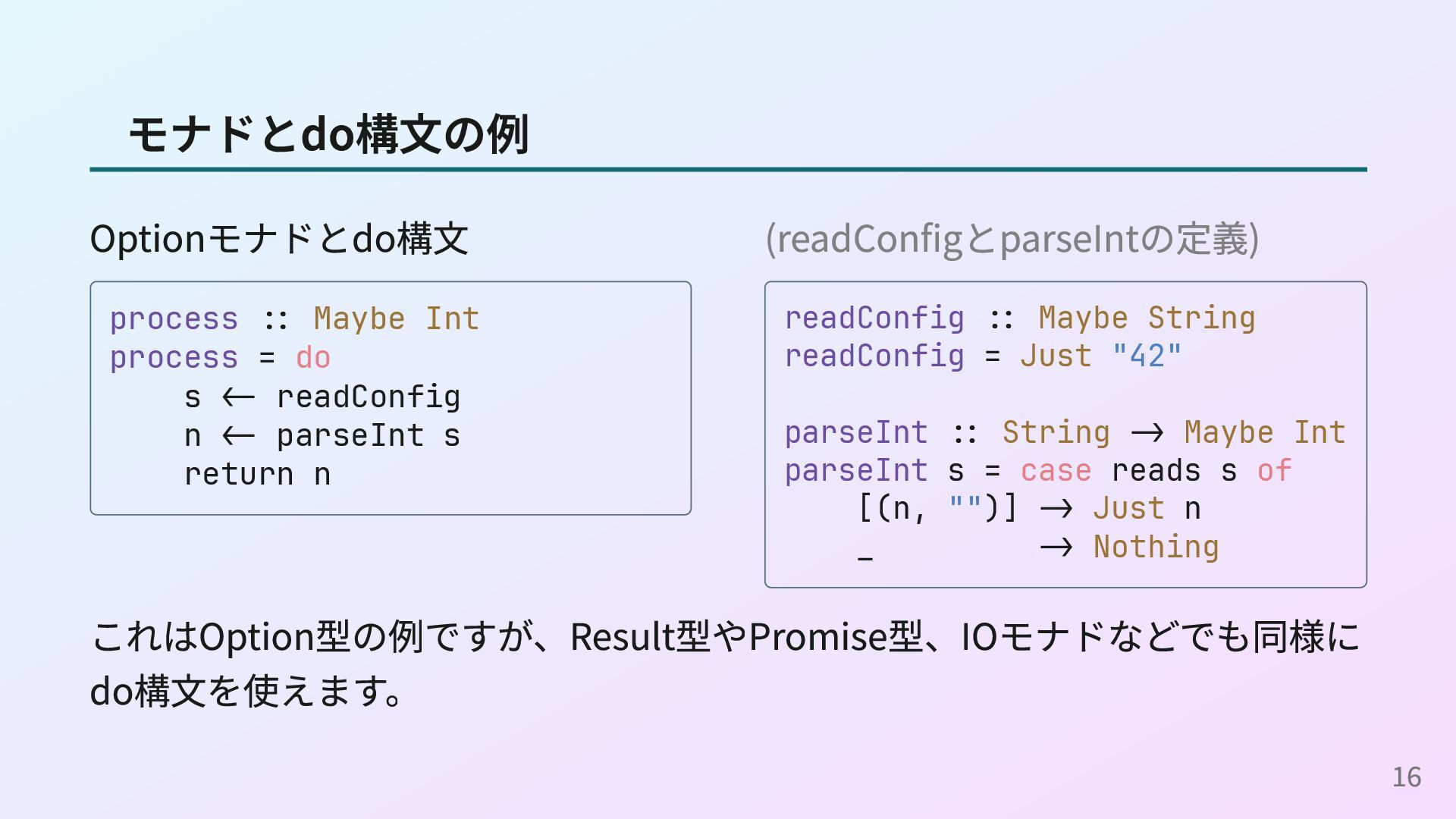 <- readConfig n <- parseInt s return n (readConfigとparseIntの定義) readConfig :: Maybe String readConfig = Just "42" parseInt :: String -> Maybe Int parseInt s = case reads s of [(n, "")] -> Just n _ -> Nothing これはOption型の例ですが、Result型やPromise型、IOモナドなどでも同様に do構文を使えます。 16