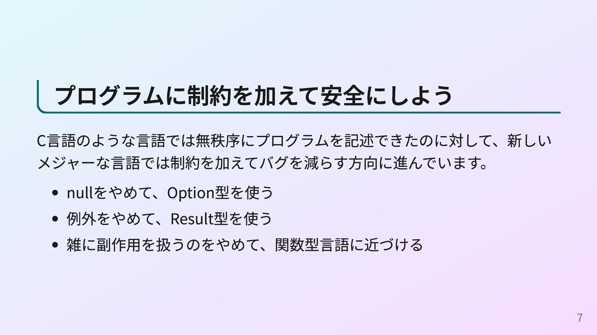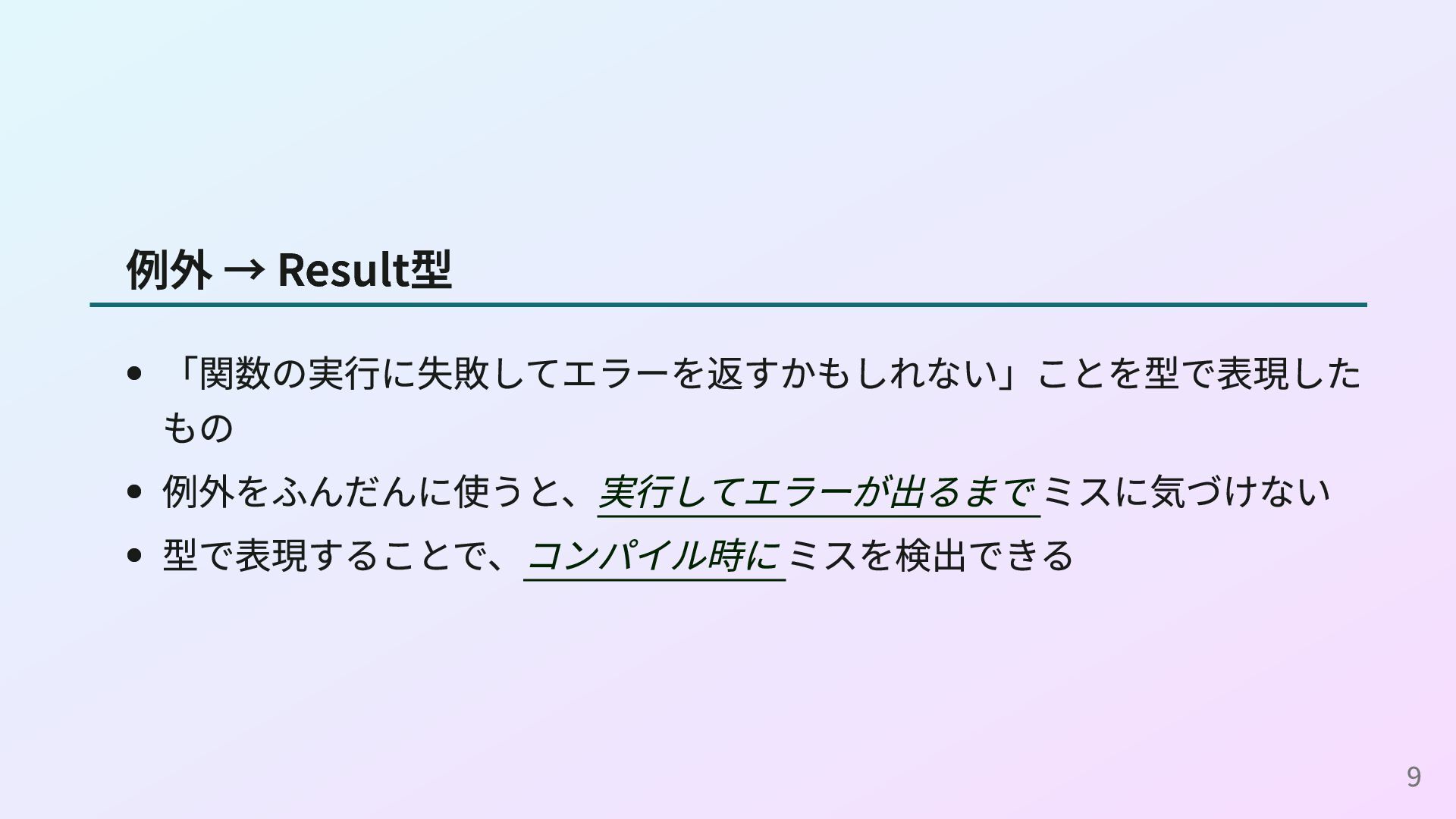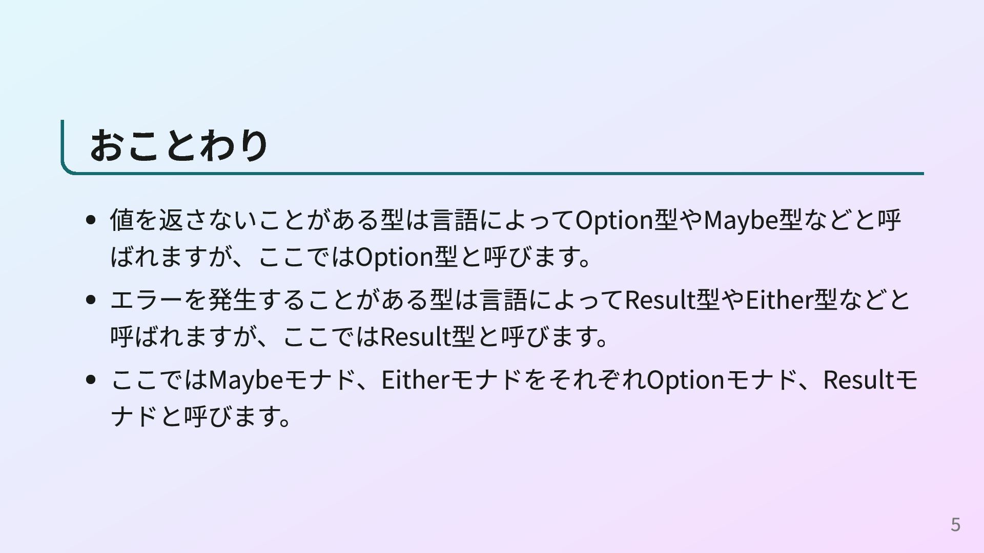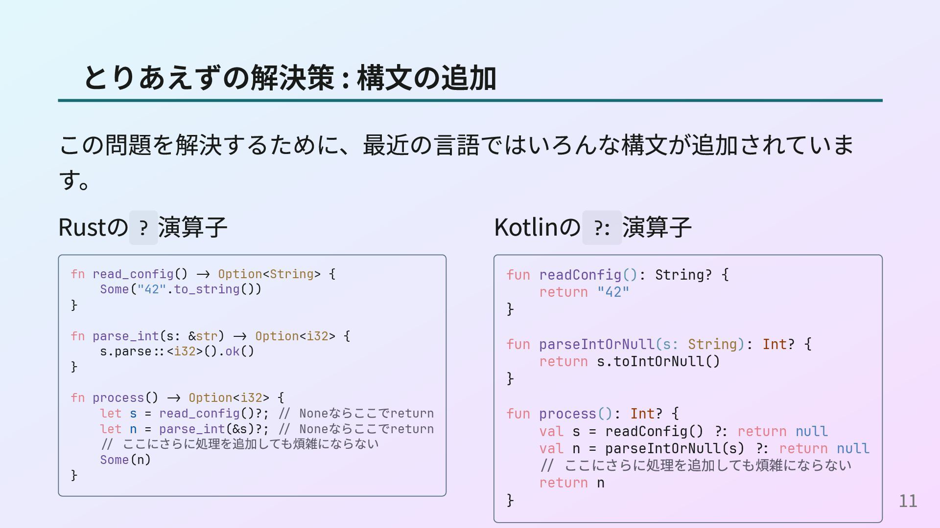 <- readConfig n <- parseInt s return n (readConfigとparseIntの定義) readConfig :: Maybe String readConfig = Just "42" parseInt :: String -> Maybe Int parseInt s = case reads s of [(n, "")] -> Just n _ -> Nothing これはOption型の例ですが、Result型やPromise型、IOモナドなどでも同様に do構文を使えます。 16