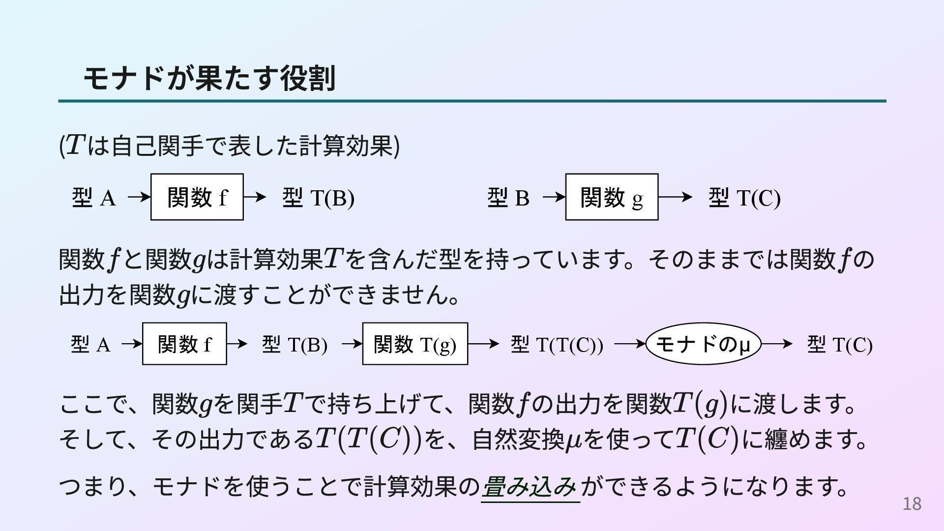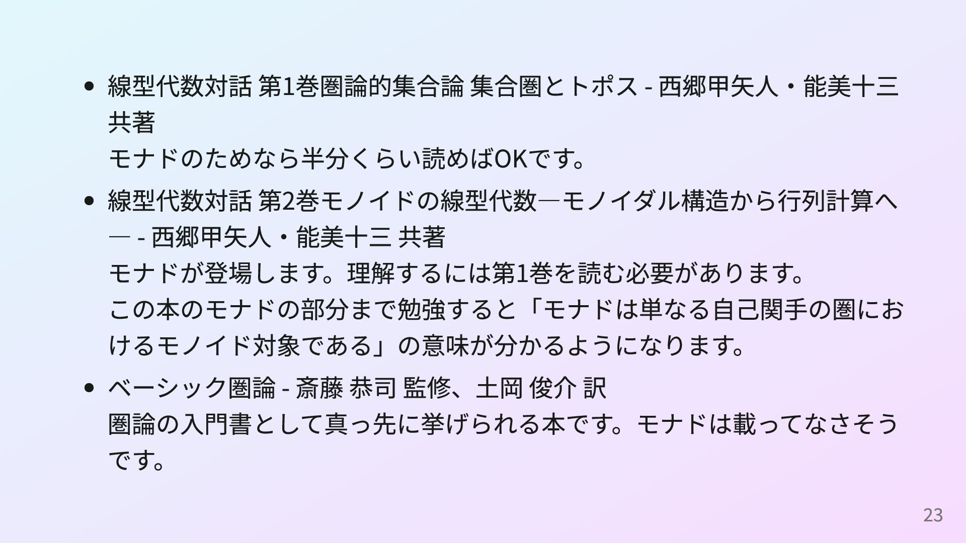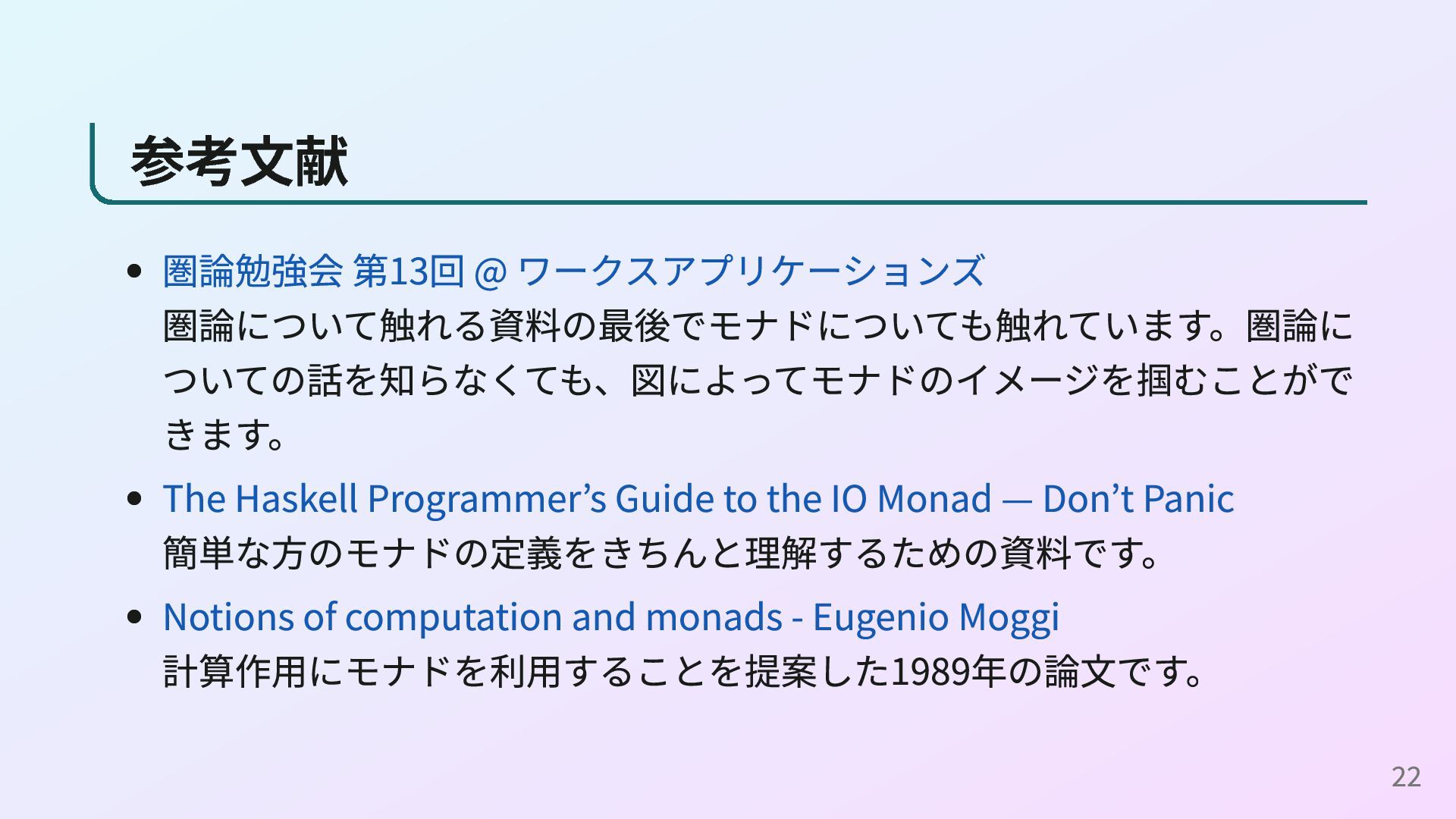 Programmer’s Guide to the IO Monad — Don’t Panic 簡単な方のモナドの定義をきちんと理解するための資料です。 Notions of computation and monads - Eugenio Moggi 計算作用にモナドを利用することを提案した1989年の論文です。 22