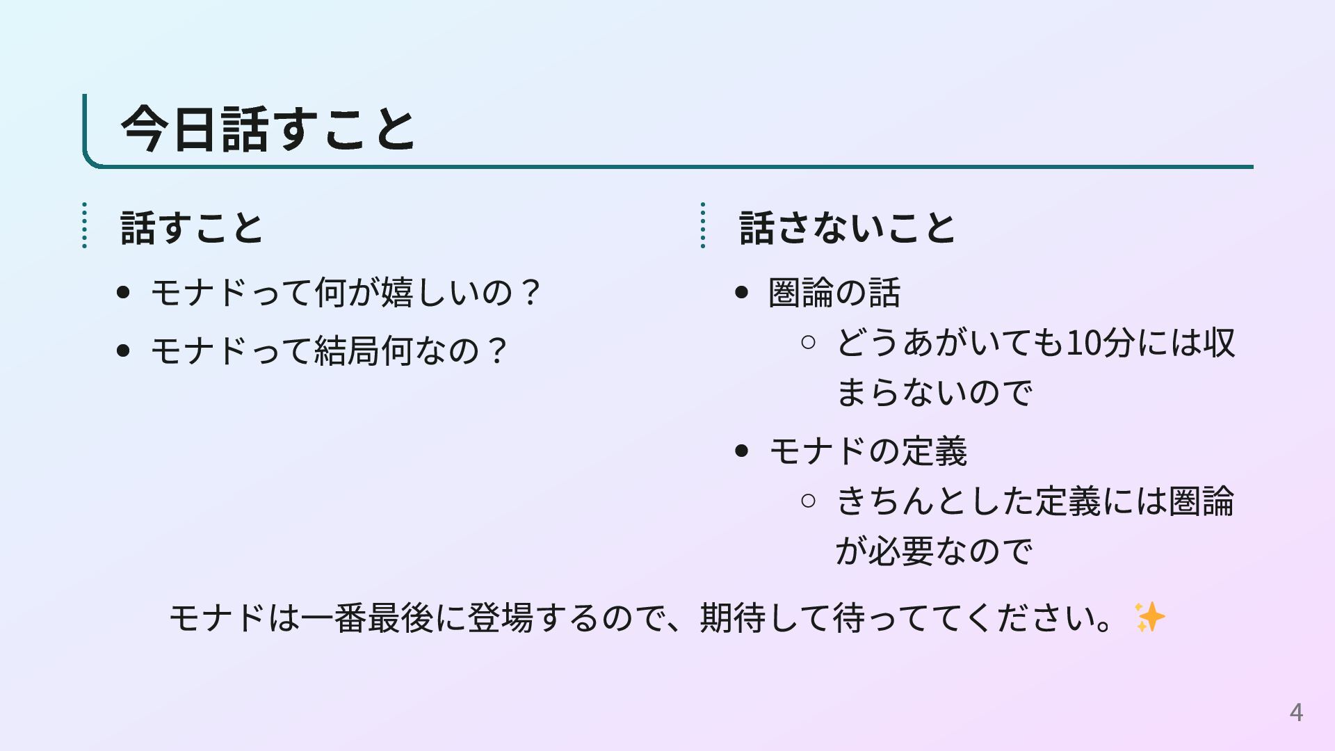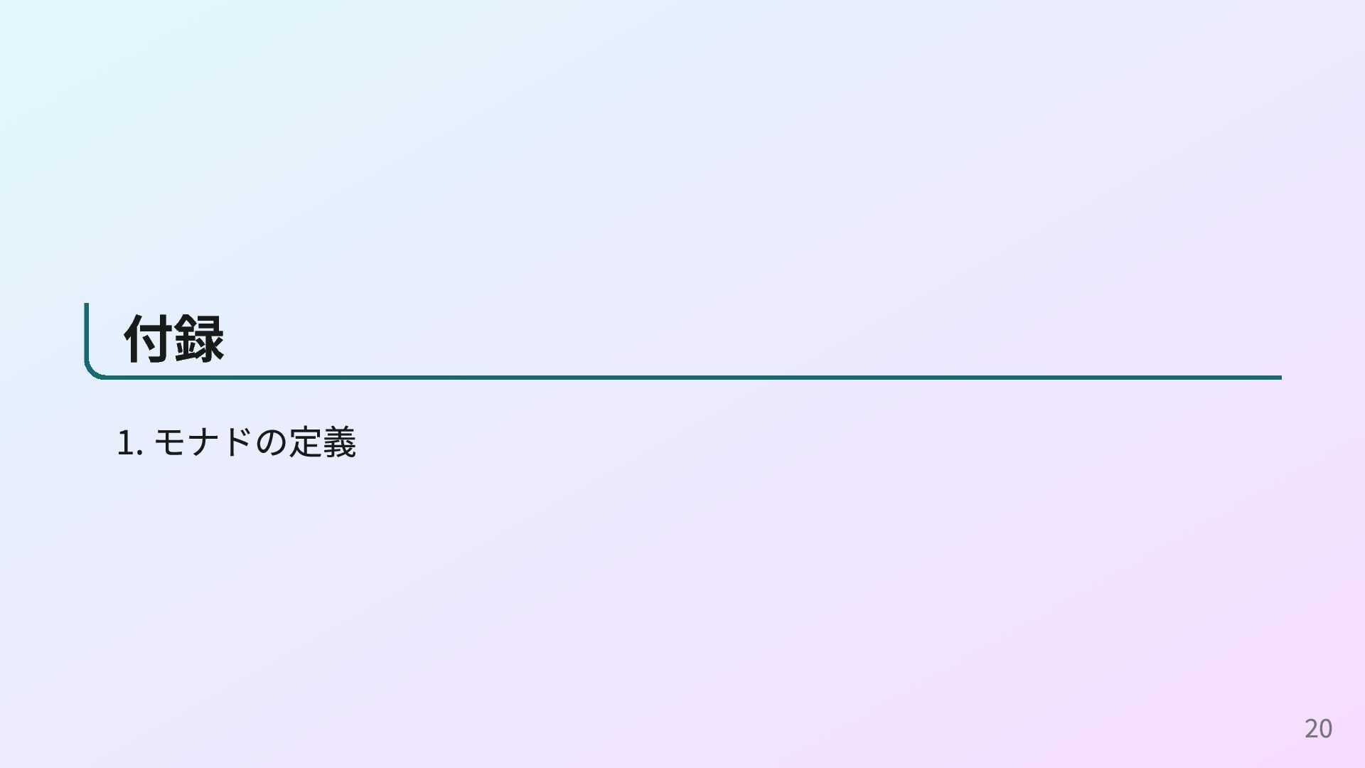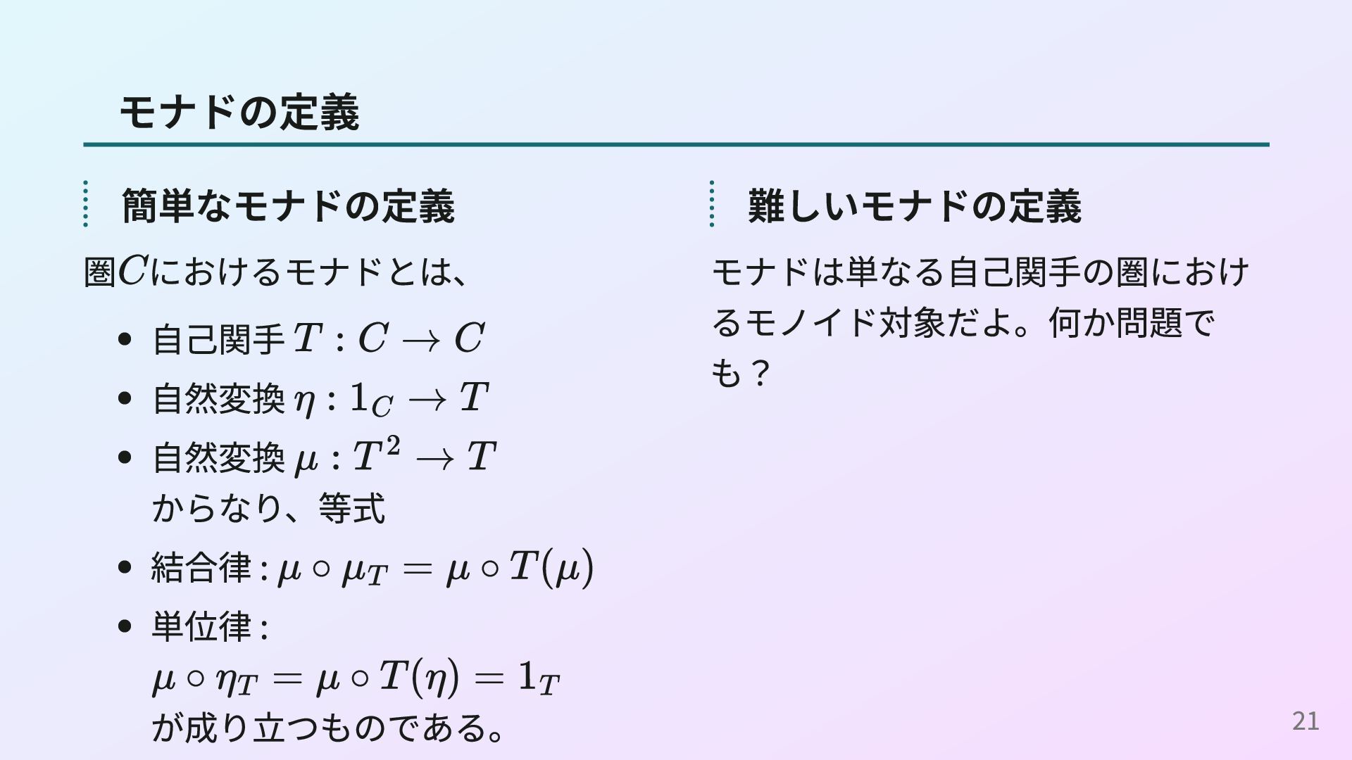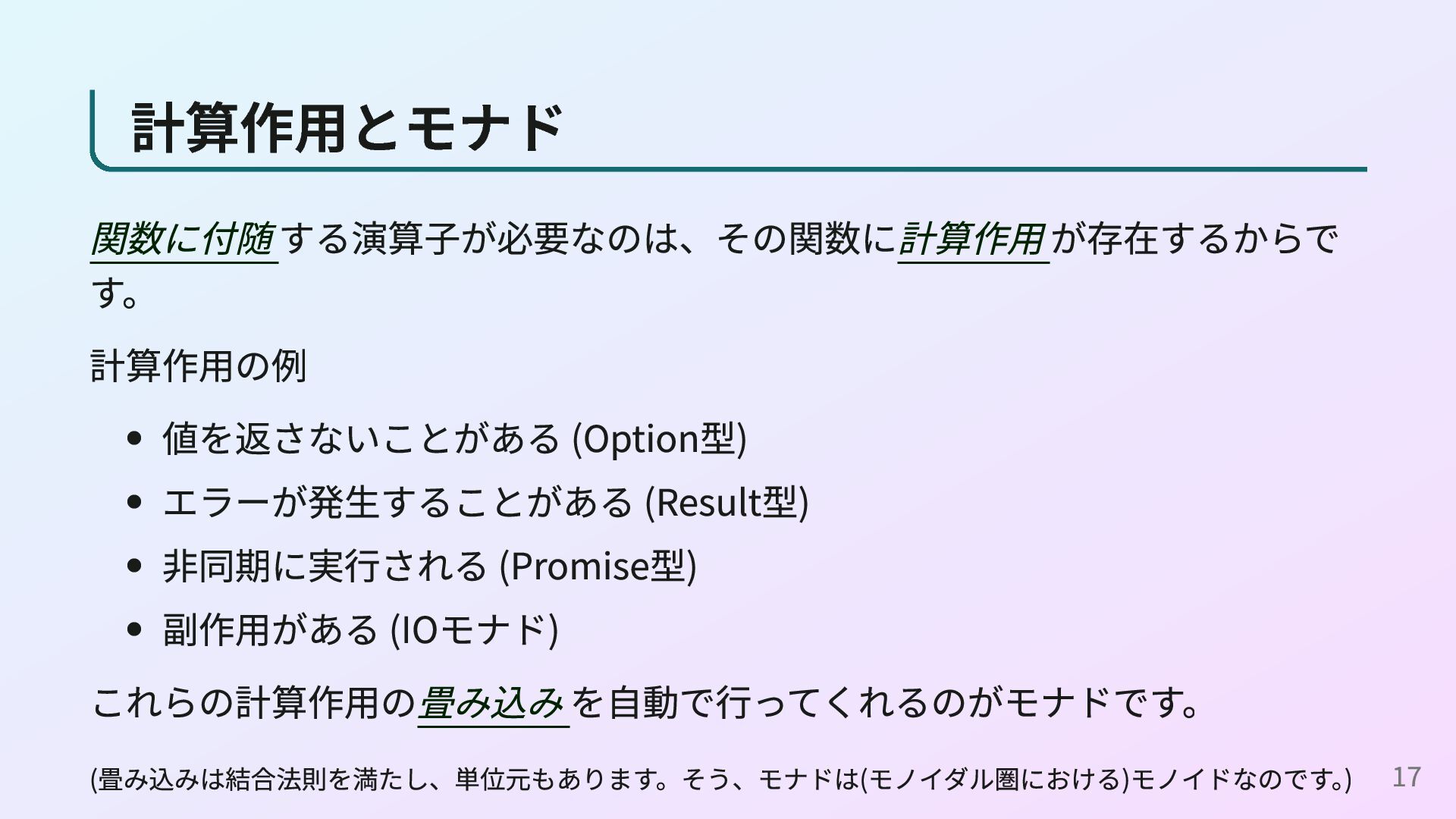 Programmer’s Guide to the IO Monad — Don’t Panic 簡単な方のモナドの定義をきちんと理解するための資料です。 Notions of computation and monads - Eugenio Moggi 計算作用にモナドを利用することを提案した1989年の論文です。 22
