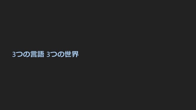 おわりに これまでに3つの言語を紹介してきましたが、今回は省いたScalaやRust、そしてまだ知 らない未知なる言語が、世の中にはたくさんあります。 それらの言語は、汎用的なプログラムを書けるようにしたり、特定の分野に限定して 楽に簡単に書けるようにしたり、はたまた研究のために生み出された実験的な言語で あったりします。 一つ一つの言語はその目的を果たすために、様々な表現を生み出し組み合わせて作ら れています。 皆さんもいろいろなプログラミング言語に触れて、その言語の面白く、そして愛すべ き点を見つけてみてください。そしてぜひ、私にその点を教えて下さい。