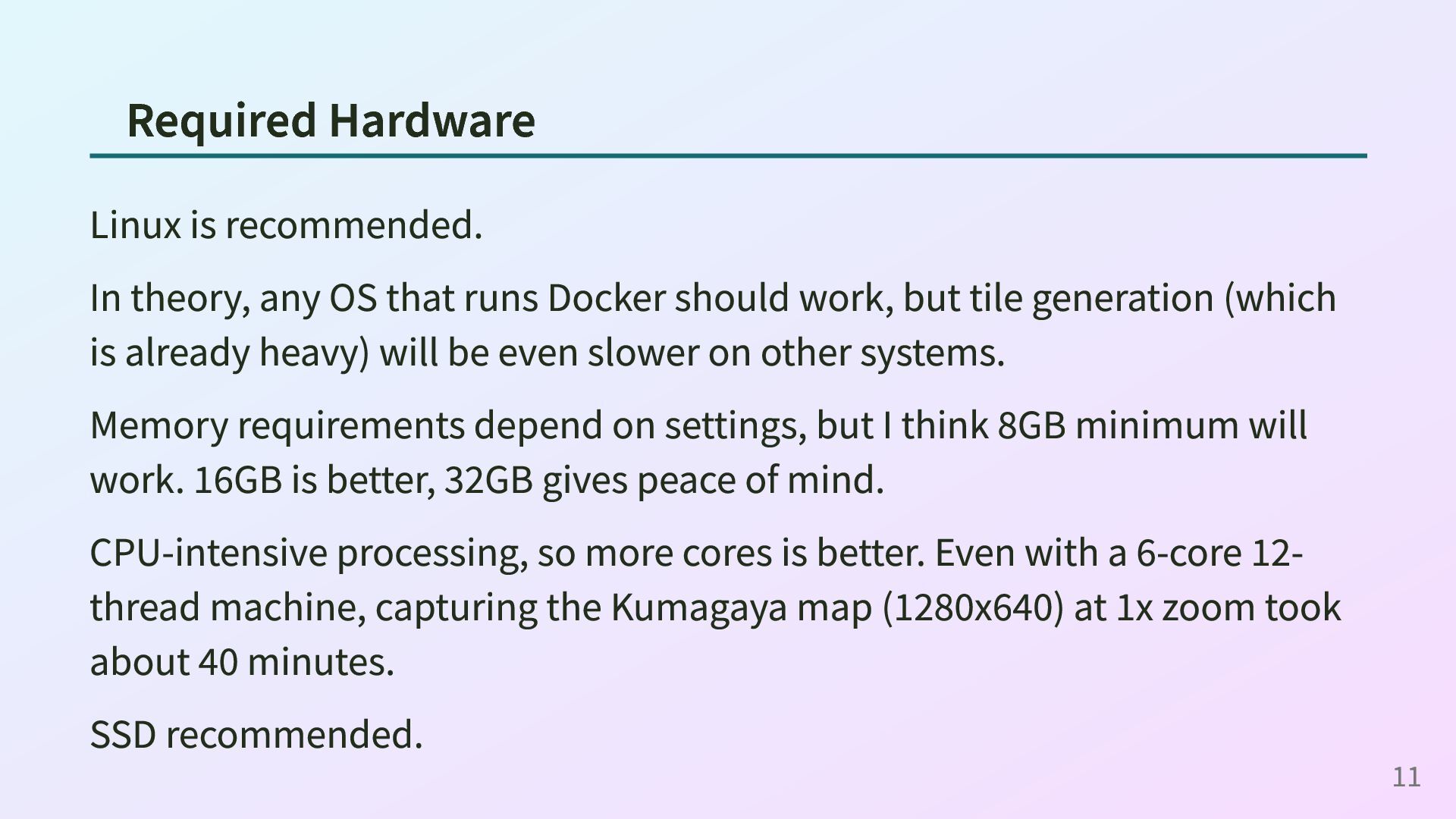 runs Docker should work, but tile generation (which is already heavy) will be even slower on other systems. Memory requirements depend on settings, but I think 8GB minimum will work. 16GB is better, 32GB gives peace of mind. CPU-intensive processing, so more cores is better. Even with a 6-core 12- thread machine, capturing the Kumagaya map (1280x640) at 1x zoom took about 40 minutes. SSD recommended. 11