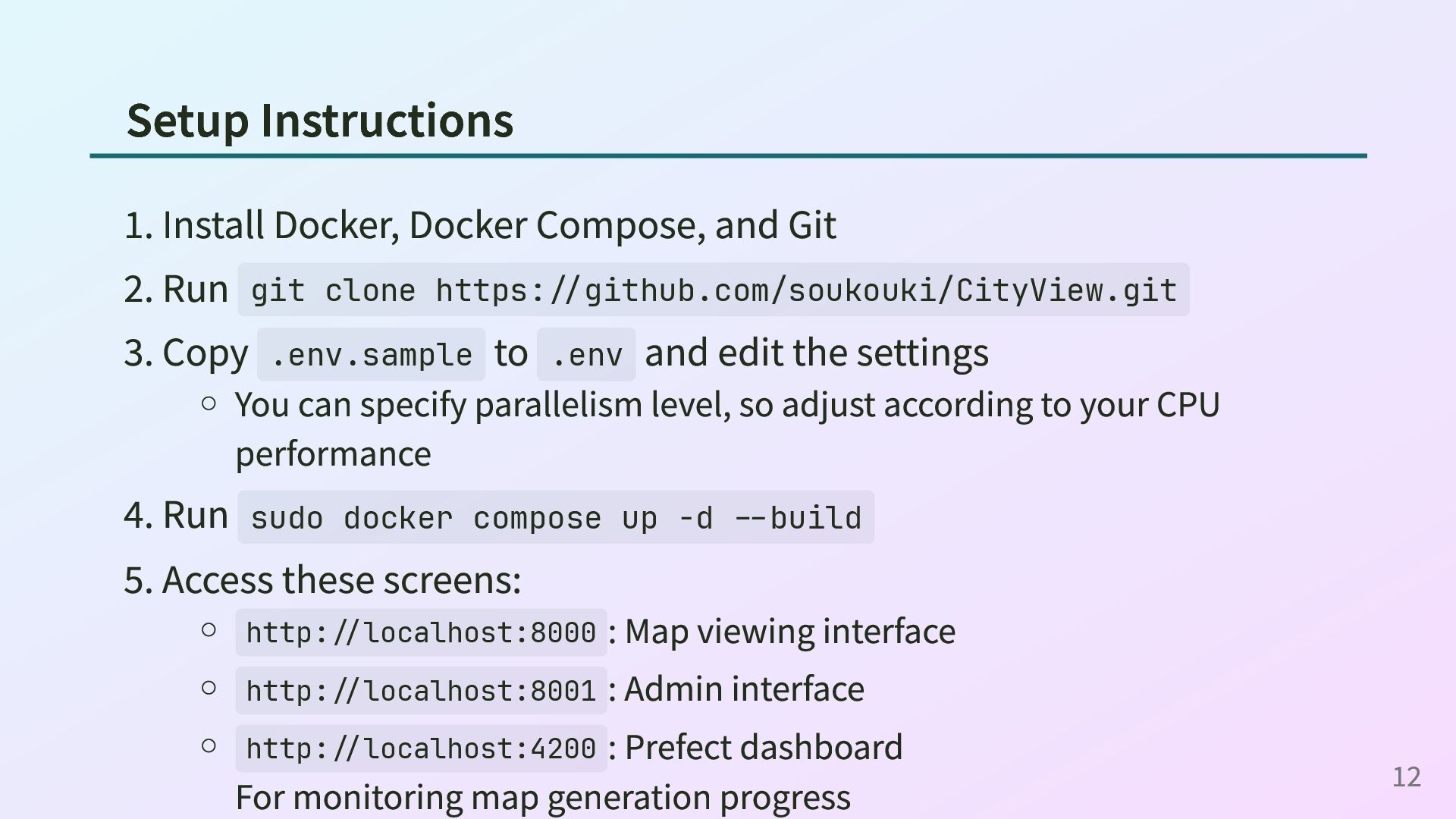 Run git clone https://github.com/soukouki/CityView.git 3. Copy .env.sample to .env and edit the settings You can specify parallelism level, so adjust according to your CPU performance 4. Run sudo docker compose up -d --build 5. Access these screens: http://localhost:8000 : Map viewing interface http://localhost:8001 : Admin interface http://localhost:4200 : Prefect dashboard For monitoring map generation progress 12