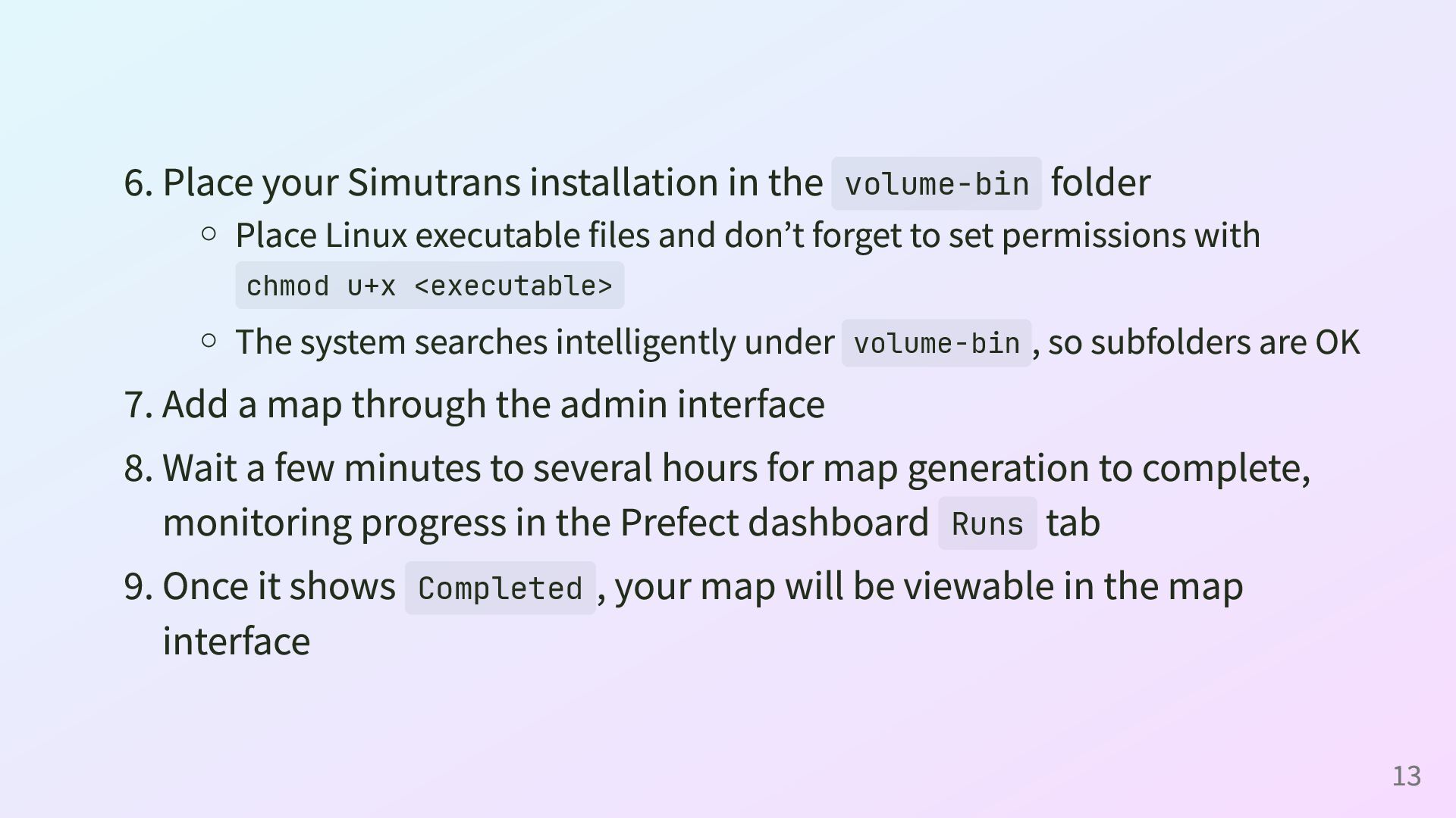 Linux executable files and don’t forget to set permissions with chmod u+x <executable> The system searches intelligently under volume-bin , so subfolders are OK 7. Add a map through the admin interface 8. Wait a few minutes to several hours for map generation to complete, monitoring progress in the Prefect dashboard Runs tab 9. Once it shows Completed , your map will be viewable in the map interface 13