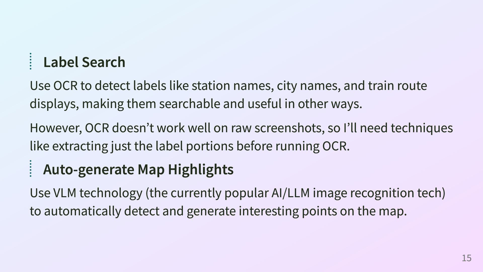 city names, and train route displays, making them searchable and useful in other ways. However, OCR doesn’t work well on raw screenshots, so I’ll need techniques like extracting just the label portions before running OCR. Auto-generate Map Highlights Use VLM technology (the currently popular AI/LLM image recognition tech) to automatically detect and generate interesting points on the map. 15