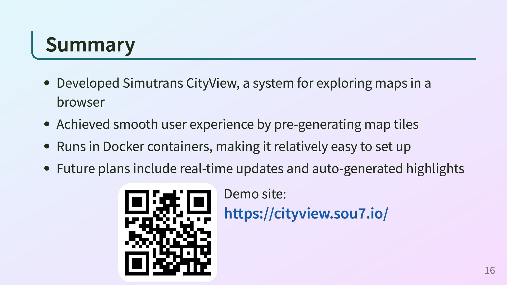 a browser Achieved smooth user experience by pre-generating map tiles Runs in Docker containers, making it relatively easy to set up Future plans include real-time updates and auto-generated highlights Demo site: https://cityview.sou7.io/ 16