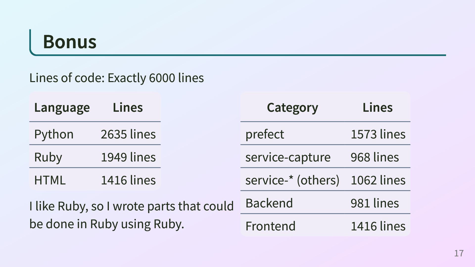 2635 lines Ruby 1949 lines HTML 1416 lines I like Ruby, so I wrote parts that could be done in Ruby using Ruby. Category Lines prefect 1573 lines service-capture 968 lines service-* (others) 1062 lines Backend 981 lines Frontend 1416 lines 17