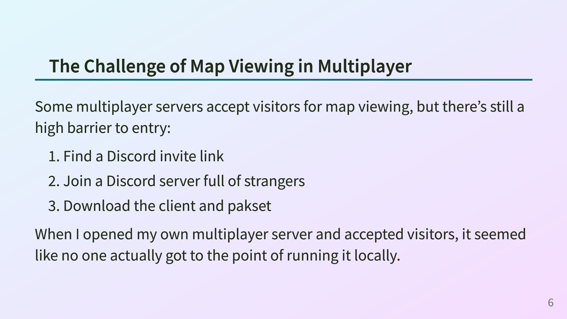 accept visitors for map viewing, but there’s still a high barrier to entry: 1. Find a Discord invite link 2. Join a Discord server full of strangers 3. Download the client and pakset When I opened my own multiplayer server and accepted visitors, it seemed like no one actually got to the point of running it locally. 6