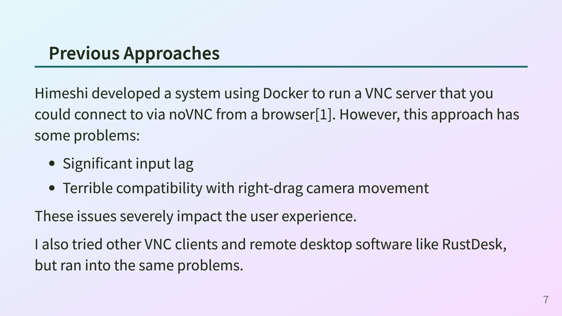 a VNC server that you could connect to via noVNC from a browser[1]. However, this approach has some problems: Significant input lag Terrible compatibility with right-drag camera movement These issues severely impact the user experience. I also tried other VNC clients and remote desktop software like RustDesk, but ran into the same problems. 7