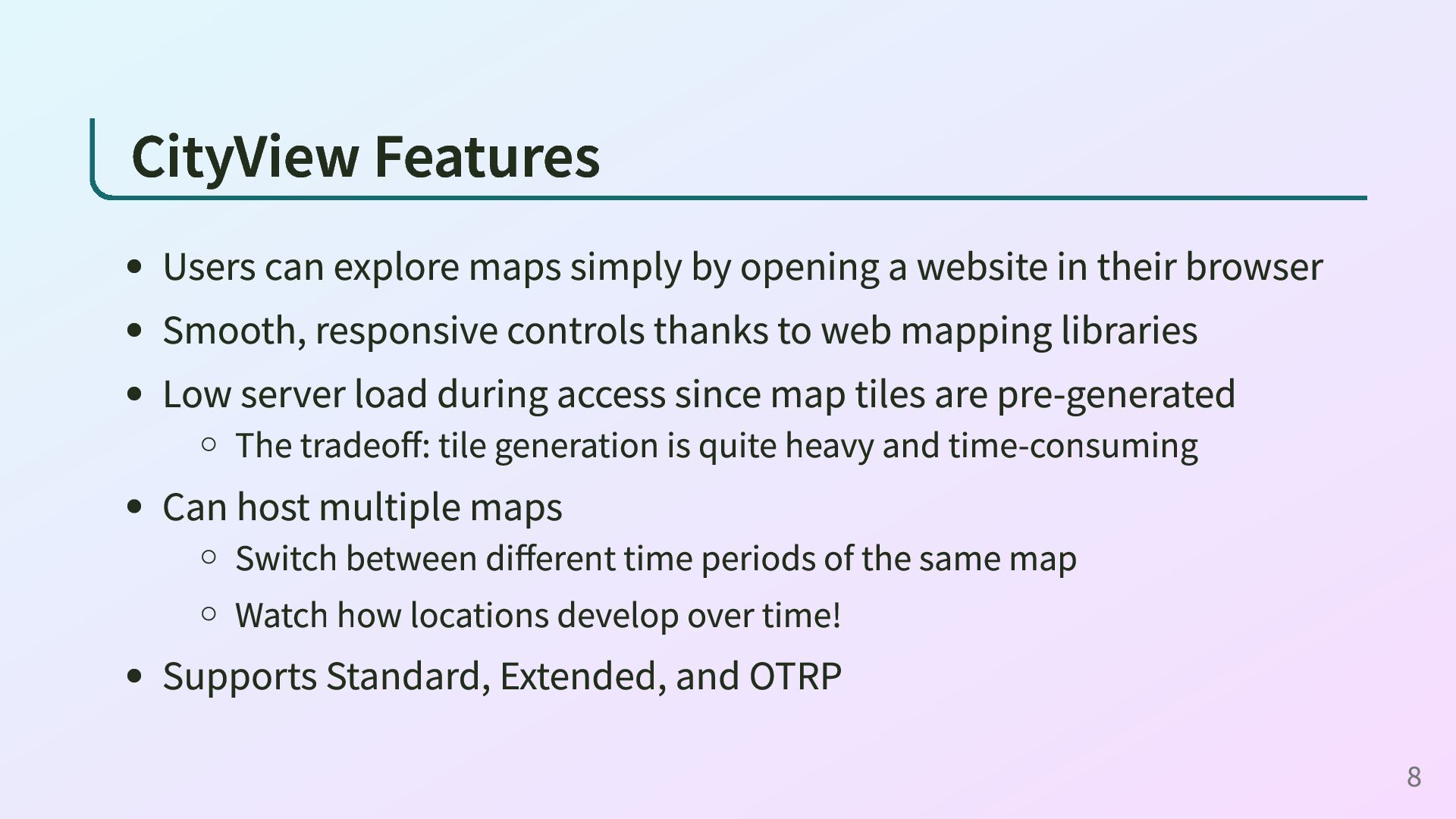 website in their browser Smooth, responsive controls thanks to web mapping libraries Low server load during access since map tiles are pre-generated The tradeoff: tile generation is quite heavy and time-consuming Can host multiple maps Switch between different time periods of the same map Watch how locations develop over time! Supports Standard, Extended, and OTRP 8