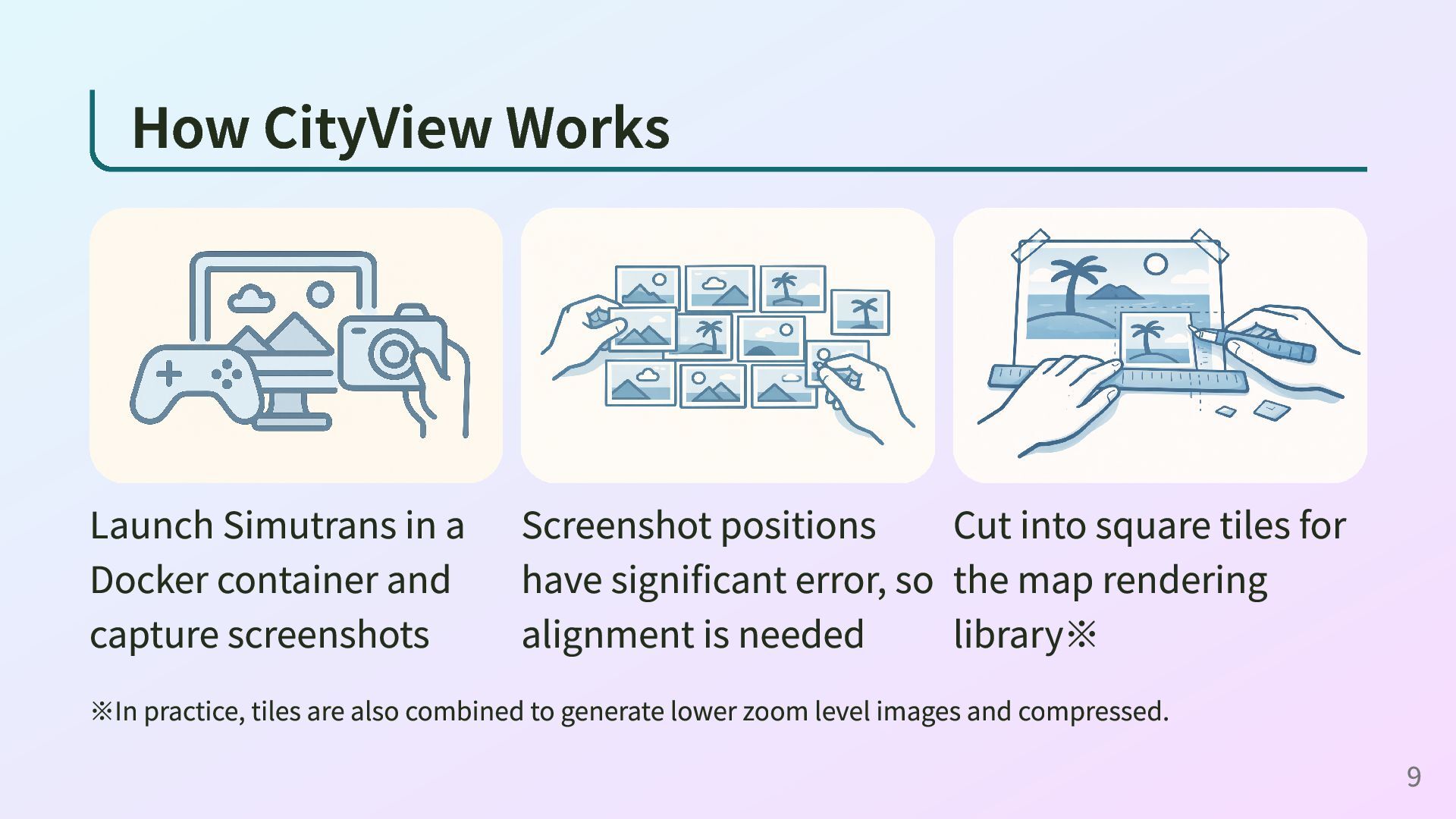 capture screenshots Screenshot positions have significant error, so alignment is needed Cut into square tiles for the map rendering library※ ※In practice, tiles are also combined to generate lower zoom level images and compressed. 9