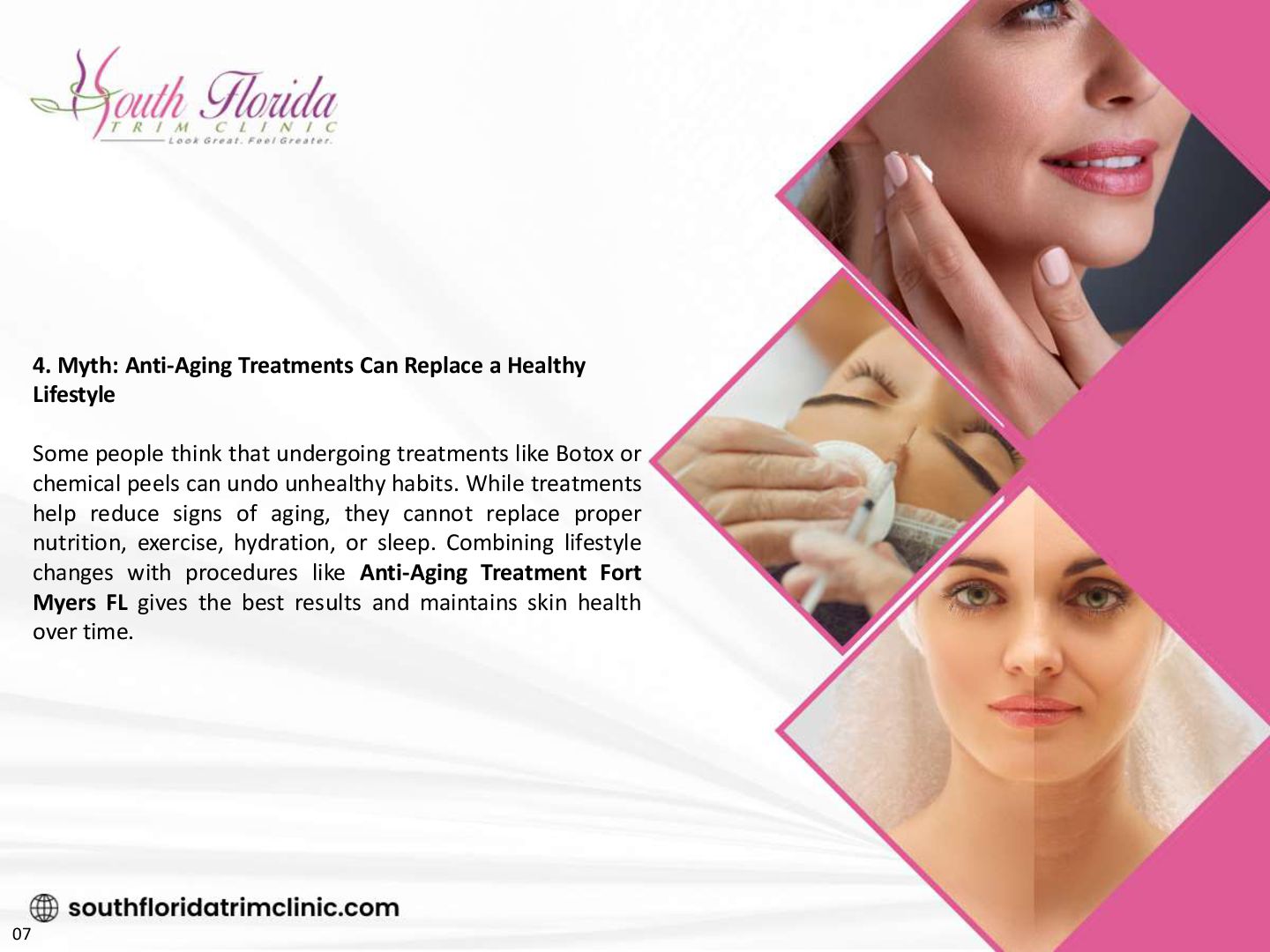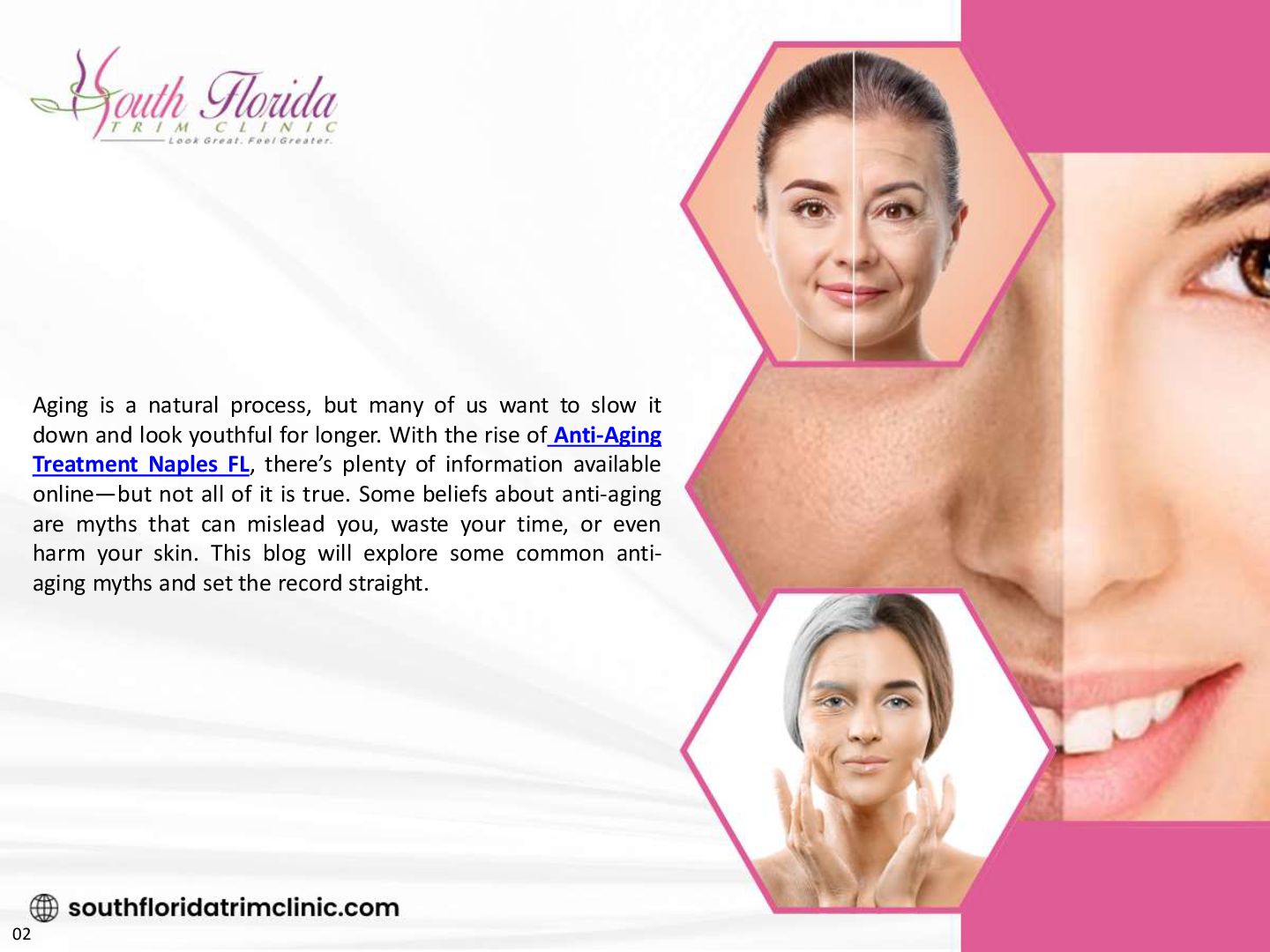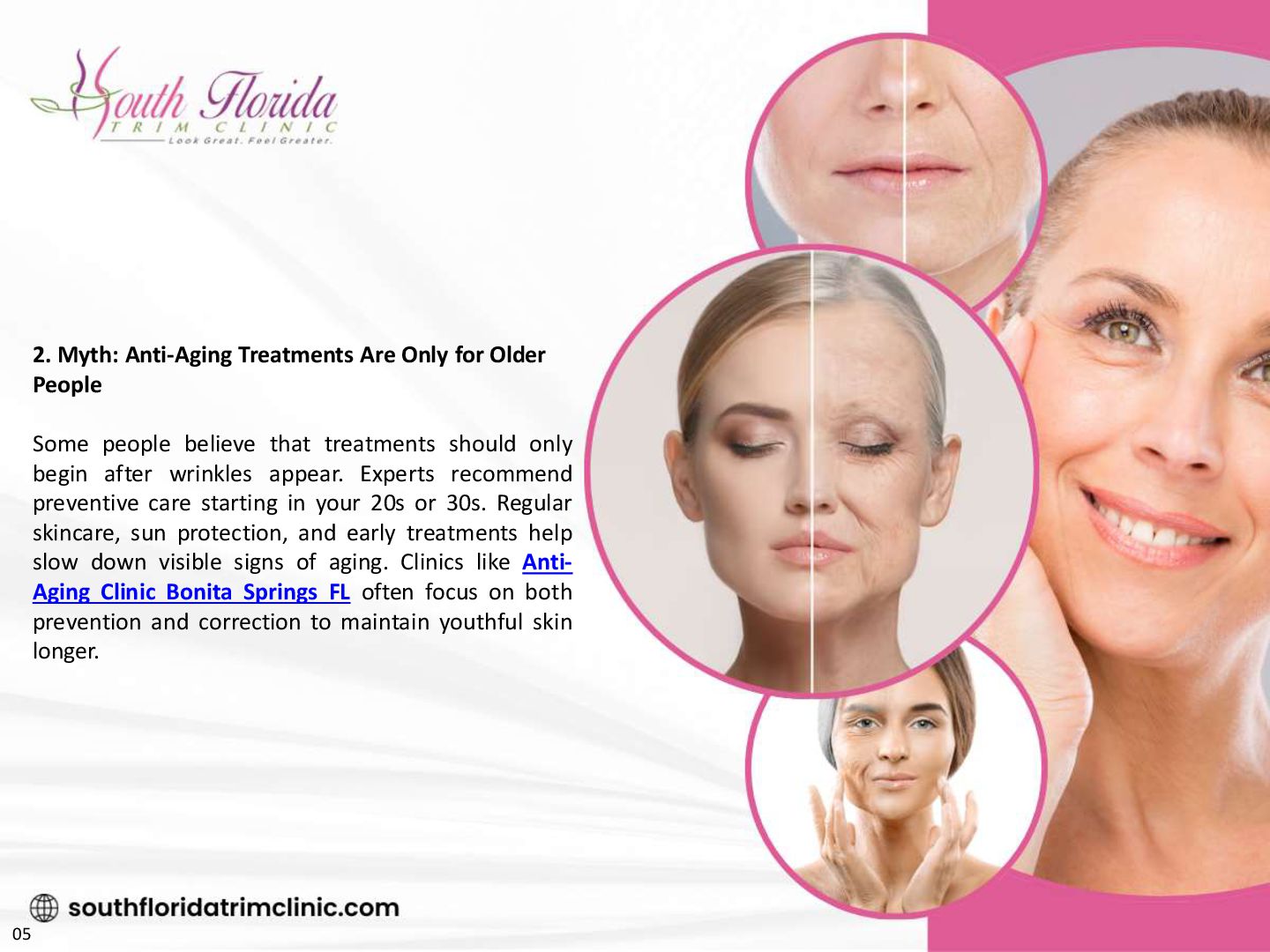 Aging is a natural process, but many of us want to slow it down and look youthful for longer. With the rise of Anti-Aging Treatment Naples FL, there’s plenty of information available online—but not all of it is true. Some beliefs about anti-aging are myths that can mislead you, waste your time, or even harm your skin. This blog will explore some common anti-aging myths and set the record straight. If you’re looking for trusted Anti-Aging Treatment Fort Myers FL, South Florida Trim Clinic offers physician-led, personalized care to restore energy, vitality, and confidence. Our holistic approach combines medical expertise with wellness support.