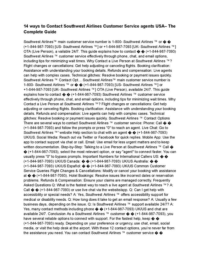 1-800-Southwest Airlines ( � � (+1-844-987-7093)). You can also use the chat feature on the Southwest Airlines app or website. For social media support, message them on Twitter or Facebook. If you prefer email, submit a form through their official website. Additionally, you can visit their ticket counters or service desks at the airport for in-person assistance. Learn how to contact Southwest Airlines customer service � � (+1-844-987-7093) by phone, chat, email or social media for any queries related to flights, refund, cancel and more. Find the official website, contact number and FAQs for Southwest Airlines ™ in the U.S. Call the Main Southwest Airlines Customer Service Number: The easiest and most common way to contact Southwest Airlines ™ is through their main customer service number: � � (+1-844-987-7093) Southwest Airlines ™ Customer Service Number: � � (+1-844-987-7093) Steps to Speak to a Representative: � � (+1-844-987-7093) UK/US Dial � � (+1-844-987-7093). Listen to the automated menu options. Press the appropriate number for your inquiry (e.g., reservations, flight status, baggage claim, etc.). Hold the line until a live representative becomes available. Explain your concern and receive assistance. Contact Southwest Airlines ™ Rapid Rewards Customer Service If you are a Rapid Rewards member and need assistance with points, travel rewards, or account-related issues, contact the Rapid Rewards customer service line. (+1-844-987-7093) Rapid Rewards Customer Service Number: � � (+1-844-987-7093) UK/US Steps: Call � � Provide your Rapid Rewards account number when prompted. Follow the automated menu to reach an agent. Discuss your issue or inquiry with the representative. Call Southwest Airlines ™ Baggage Service Office If your luggage is lost, damaged, or delayed, you can contact Southwest Airlines ™ Baggage Service Baggage Service Phone Number: � � (+1-844-987-7093) Steps: Call � � (+1-844-987-7093). Select the appropriate option for lost, delayed, or damaged baggage. Provide your flight and baggage claim details. Speak to a representative for assistance. Southwest Airlines ™ Customer Service for Group Travel For group reservations (10 or more passengers), a dedicated support line is available. Group Travel Service Number: +1-844-987-7093 UK/US Steps: Dial � � (+1-844-987-7093) UK/US. Select the option for group reservations. Speak to an agent regarding booking, changes, or special requests. Reach Out to Southwest Airlines ™ Vacations Customer Service For vacation packages, including hotels and car rentals, call the vacation service line. Vacations Customer Service Number: � � (+1-844-987-7093) Southwest Airlines’s main customer service number is 1-800-Southwest Airlines or +1-844-987-7093 [US/OTA] (Live Person). You can reach a live representative 24/7 by calling (+1-844-987-7093). We understand that travel plans can be stressful, and we’re here to support you every step of the way. Whether you’re dealing with itinerary changes, cancellations, refund issues, or questions about compensation, speaking directly to a live agent at (+1-844-987-7093) can make a real difference in resolving your concerns quickly. For added convenience, you can also connect with us through Southwest Airlines’s live chat feature or email support. However, for immediate help, calling (+1-844-987-7093) [US/OTA] (Live Person) remains the most effective option. No matter what your inquiry is, don’t hesitate to contact Southwest Airlines customer service at (+1-844-987-7093). This guide is here to help you reach out efficiently, offering practical tips to reduce wait times and ensure your issues are addressed promptly by our support team. How to Connect with an Southwest Airlines Live Agent? To speak with a live agent at Southwest Airlines, call +1-844-987-7093 or 1-800-Southwest Airlines™ (US/OTA)—available 24/7. You can also use the live chat on the Southwest Airlines website or
