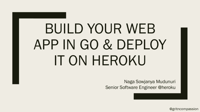 you want a particular go version ▪ Install all packages ▪ The supported go versions are – https://devcenter.heroku.com/articles/go-support#go-versions ▪ References: – https://devcenter.heroku.com/articles/getting-started-with-go @gritncompassion