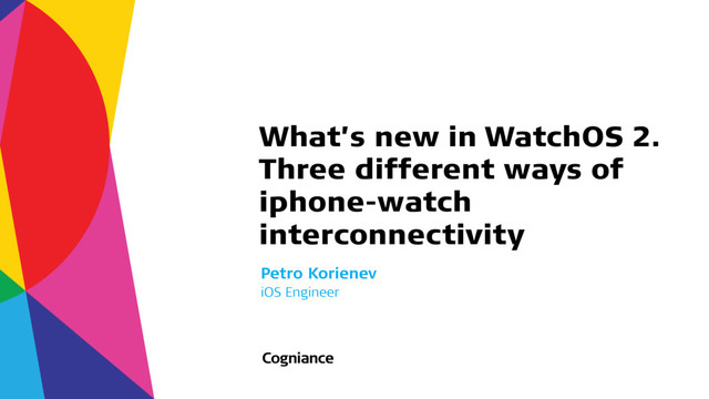 In this talk on a very basic example app (grabbing event timeline from dou.ua via import.io) watch os 2 feature called "complications" is explained. Described three ways of interconnectivity between devices operating iOS / Watch OS / Watch OS 2