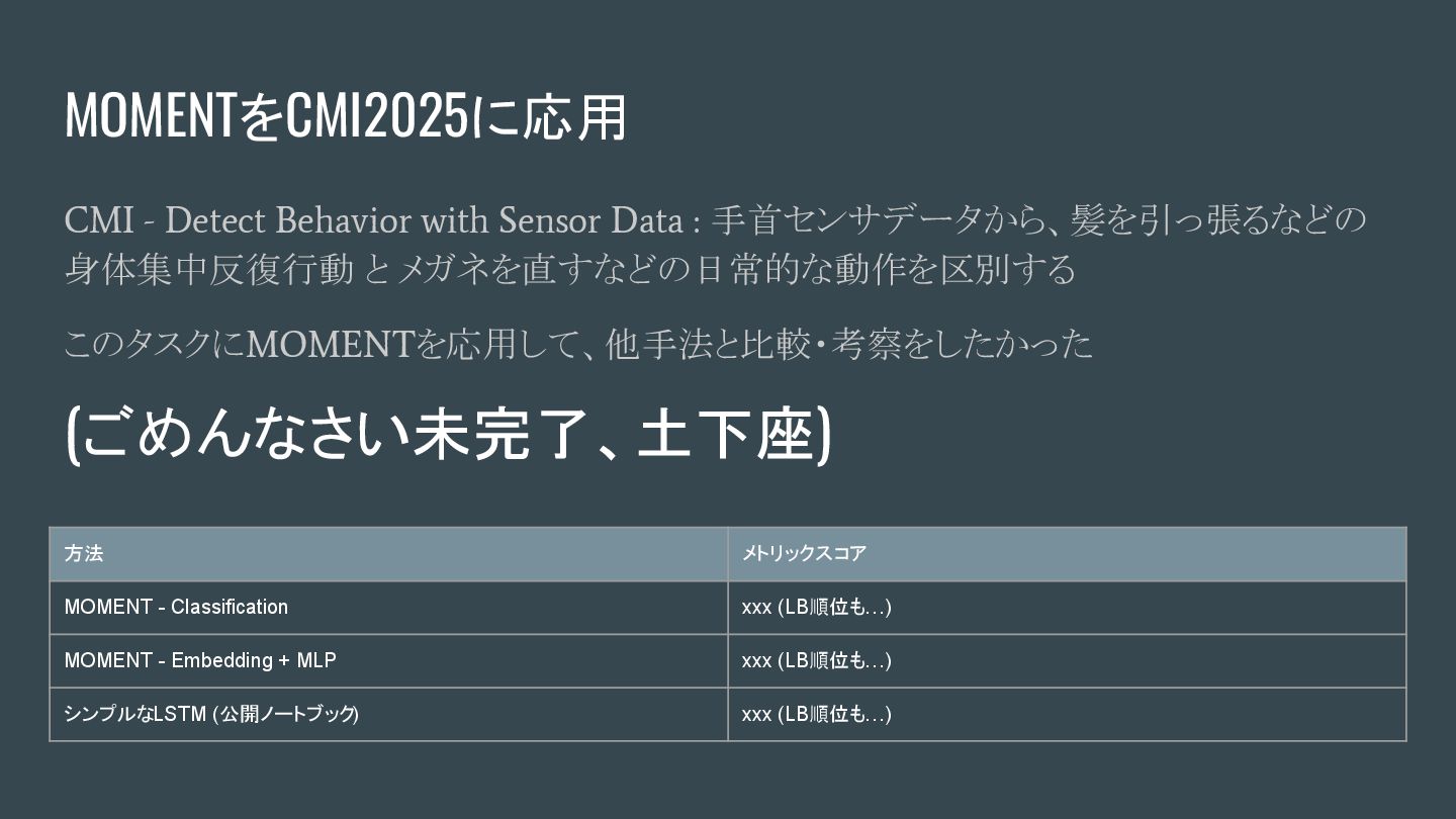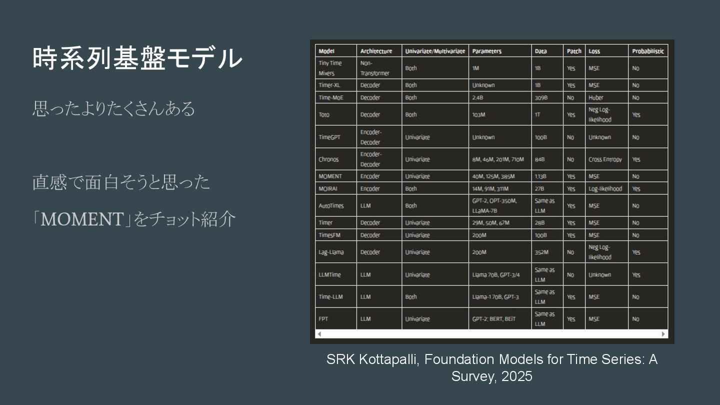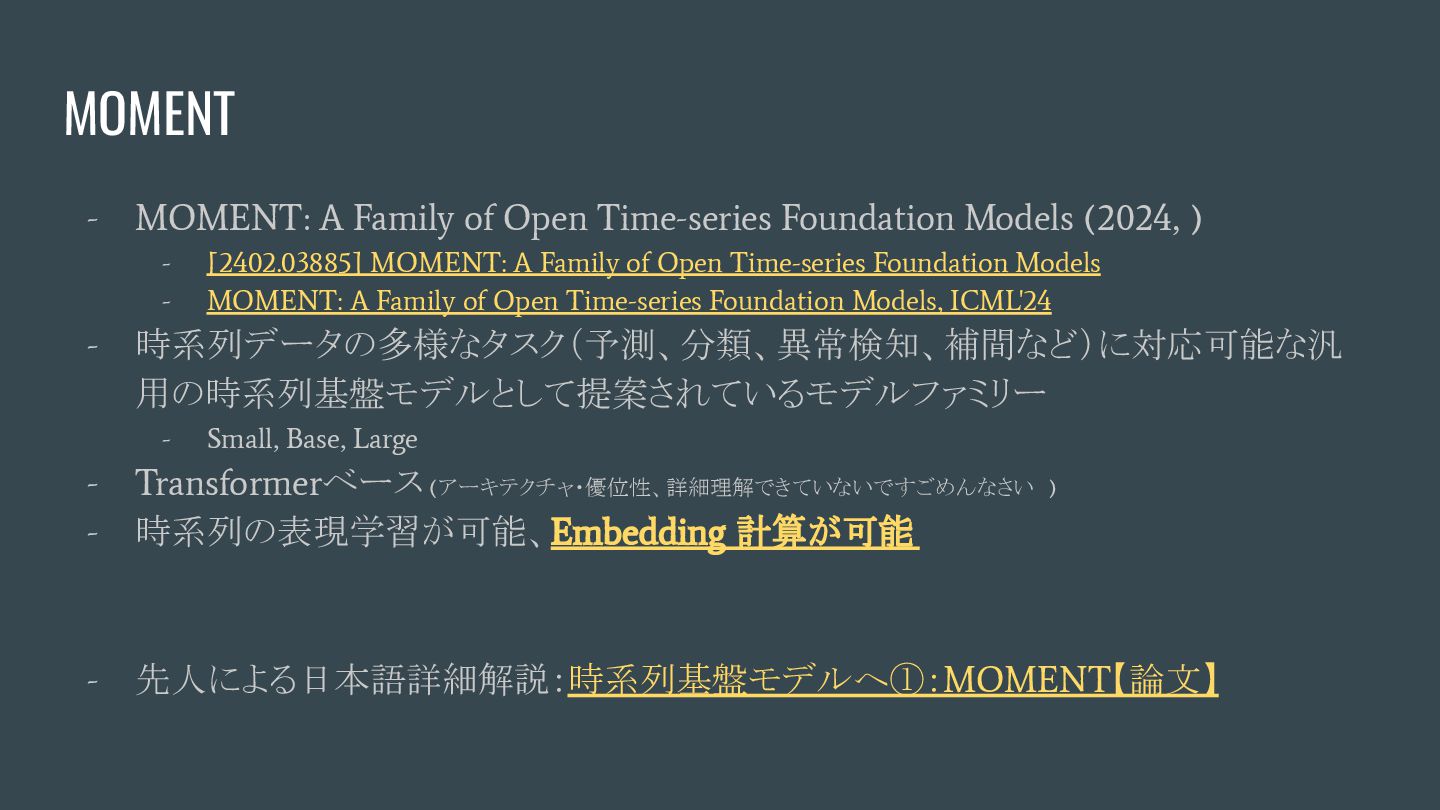 (2024, ) - [2402.03885] MOMENT: A Family of Open Time-series Foundation Models - MOMENT: A Family of Open Time-series Foundation Models, ICML'24 - 時系列データの多様なタスク(予測、分類、異常検知、補間など)に対応可能な汎 用の時系列基盤モデルとして提案されているモデルファミリー - Small, Base, Large - Transformerベース (アーキテクチャ・優位性、詳細理解できていないですごめんなさい ) - 時系列の表現学習が可能、Embedding 計算が可能 - 先人による日本語詳細解説:時系列基盤モデルへ①:MOMENT【論文】