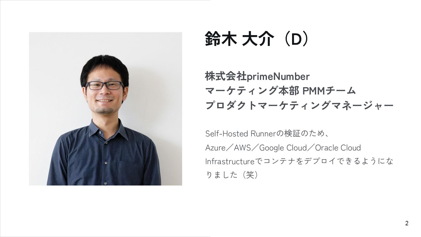 2 鈴木 大介(D) 株式会社primeNumber マーケティング本部 PMMチーム プロダクトマーケティングマネージャー Self-Hosted Runnerの検証のため、 Azure/AWS/Google
