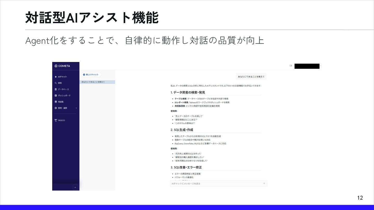 12 対話型AIアシスト機能 Agent化をすることで、自律的に動作し対話の品質が向上