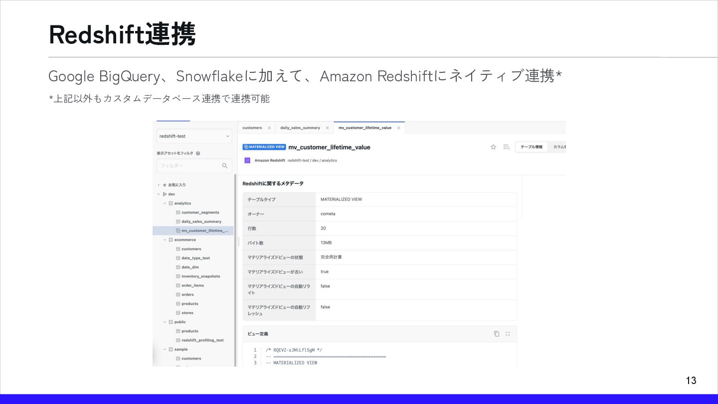 13 Redshift連携 Google BigQuery、Snowflakeに加えて、Amazon Redshiftにネイティブ連携* *上記以外もカスタムデータベース連携で連携可能