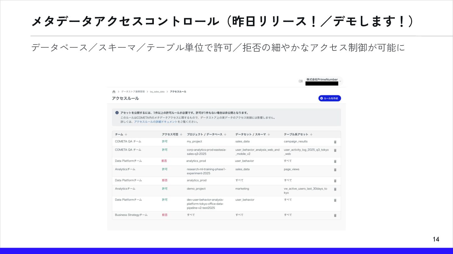 14 メタデータアクセスコントロール(昨日リリース!/デモします!) データベース/スキーマ/テーブル単位で許可/拒否の細やかなアクセス制御が可能に